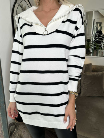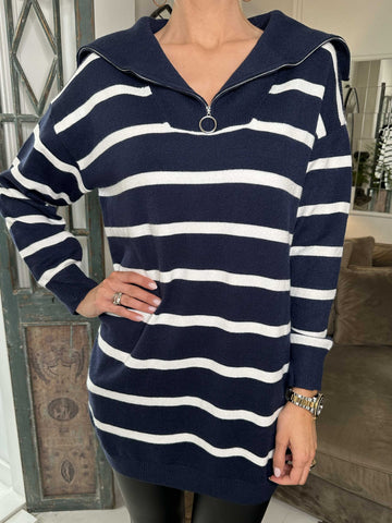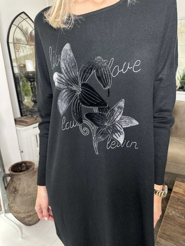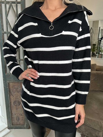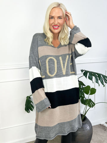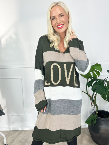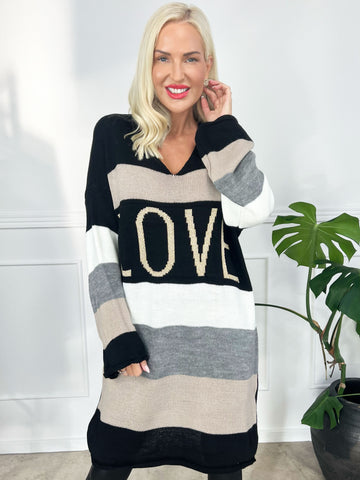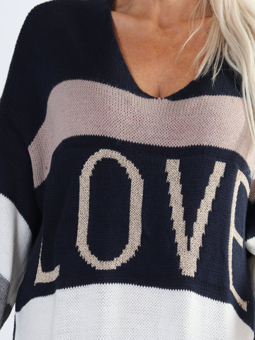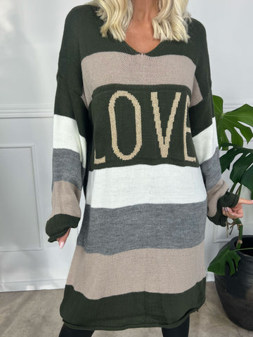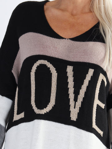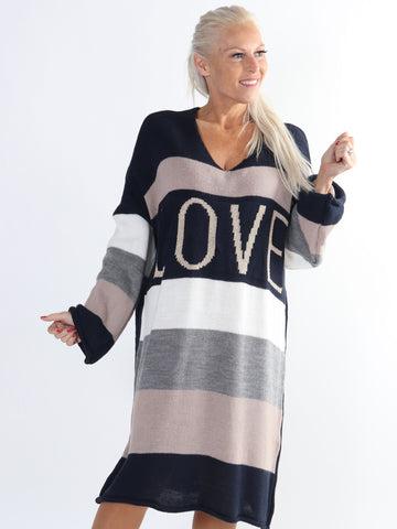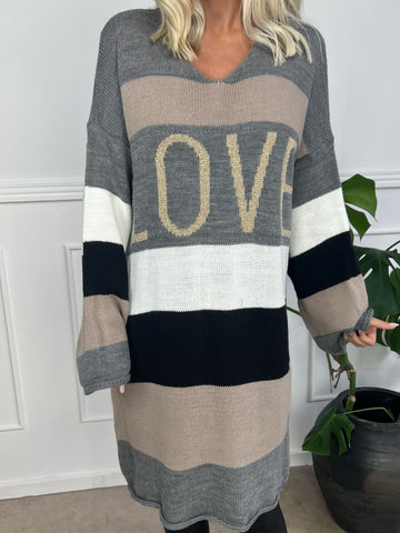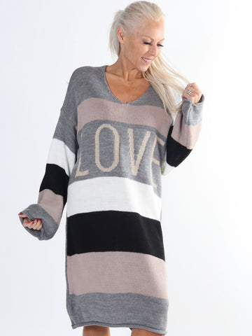 Love - Strikkjole med brede striber og skrift med glimmertråde