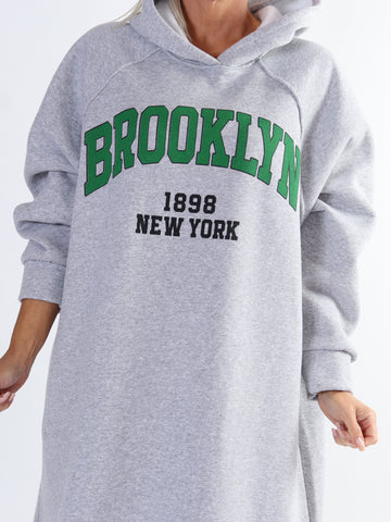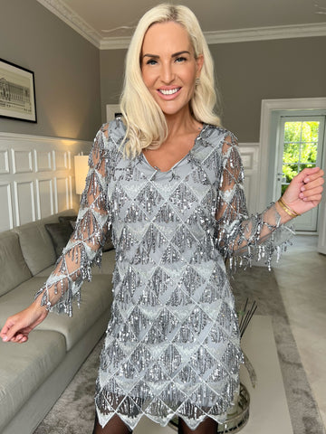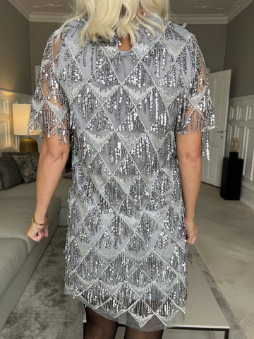 Sofie Long Sleeve - Grå og sølv langærmet kjole med pailletfrynser