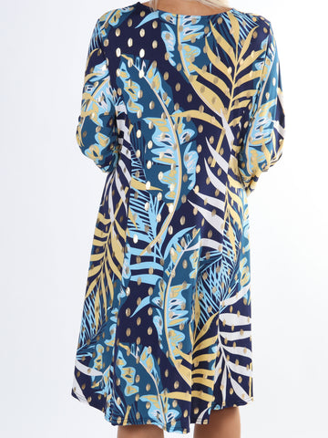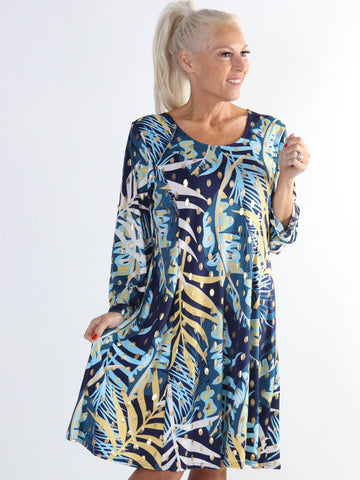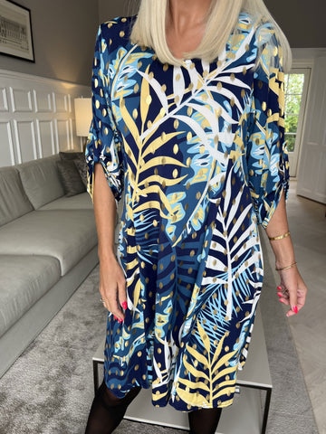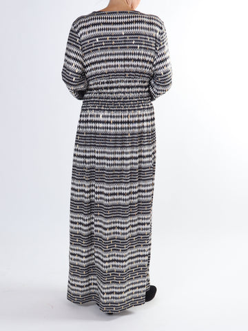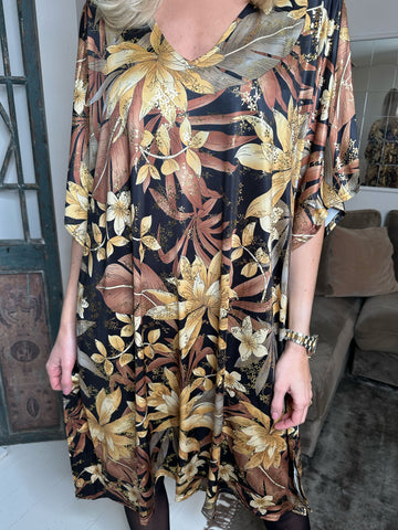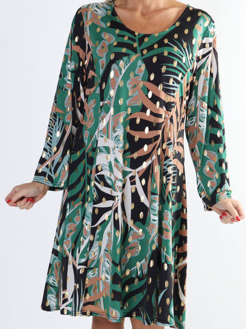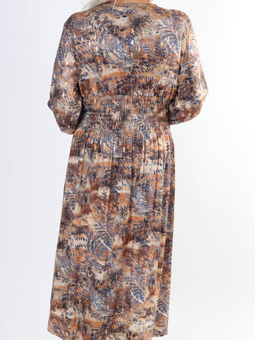 Maj Pattern L/S - Elastisk plus size kjole i print med gulddetaljer