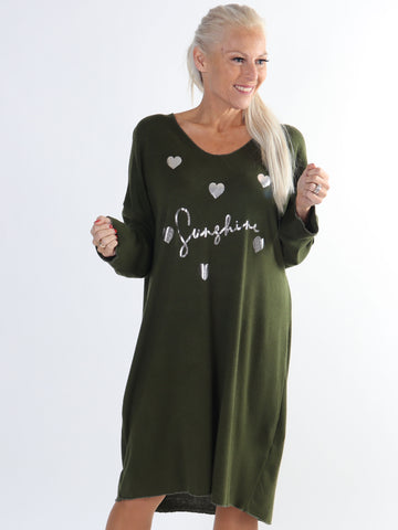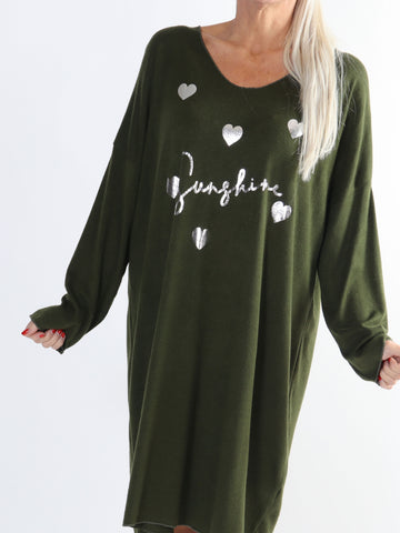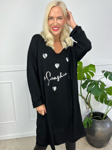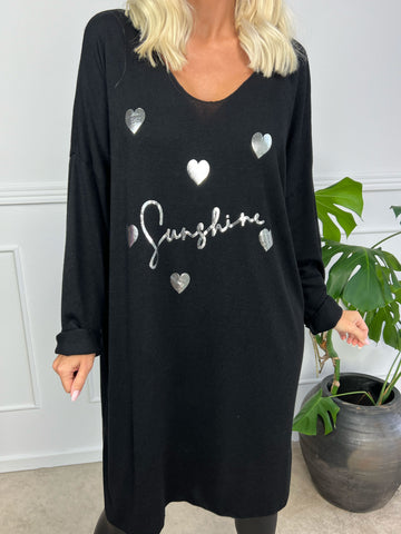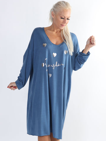 Lucia - Blød kjole i viskose med print af sølv hjerter og skrift