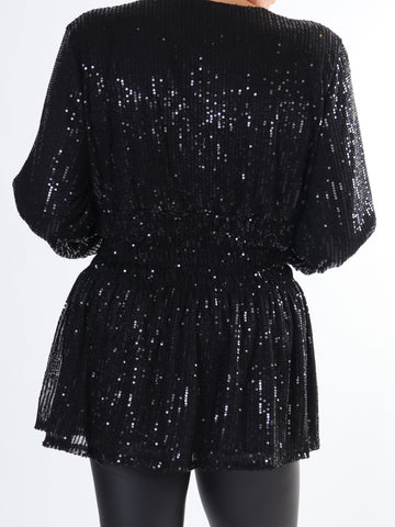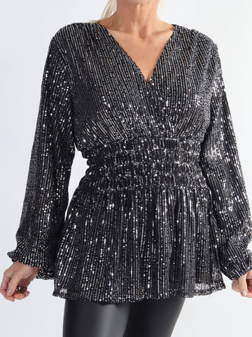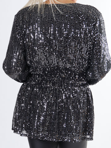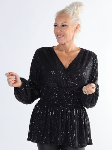 Pams Glitter Shirt L/S - Plus size bluse med pailletter og lange ærmer