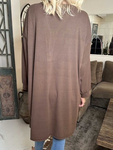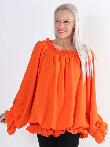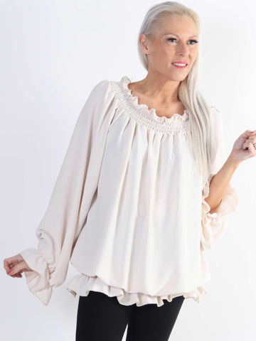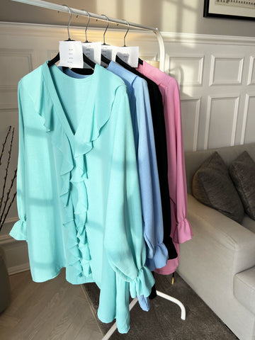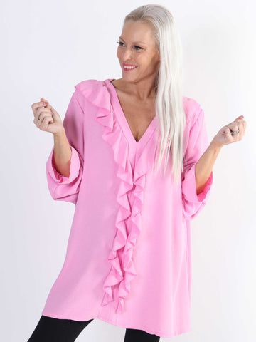 Monik - Ensfarvet tunika med elastik- og flæsekanter