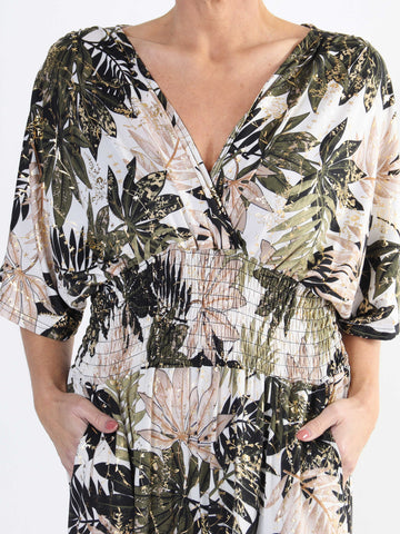 Pams Gold Leaf Jumpsuit - Elastisk plus size buksedragt med bladmønster