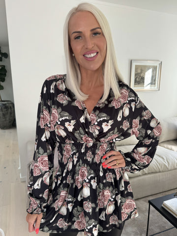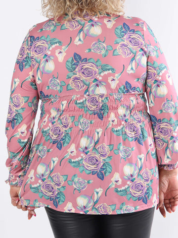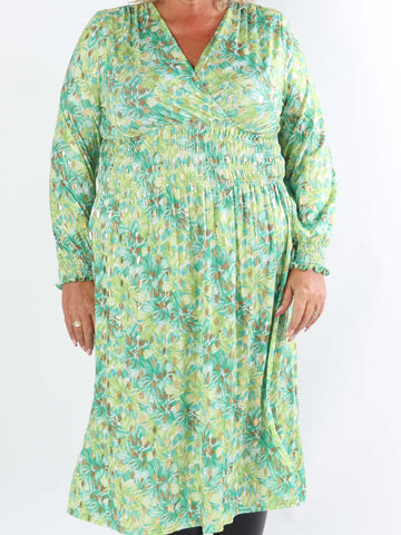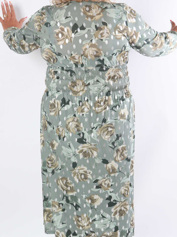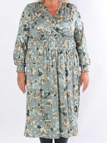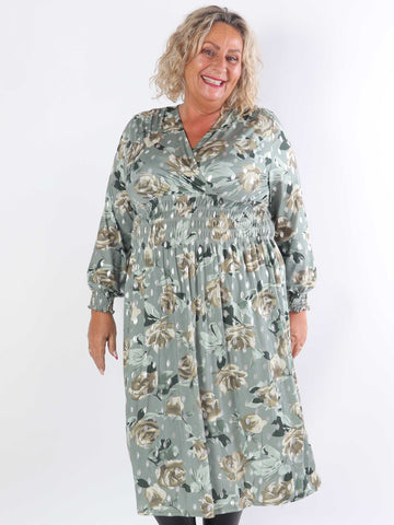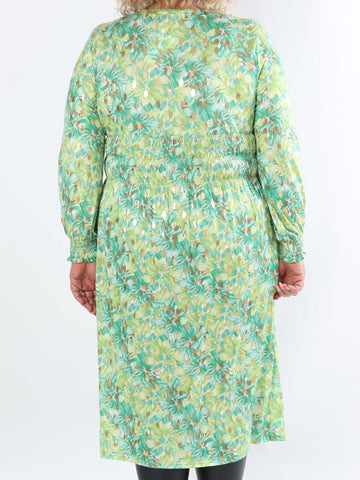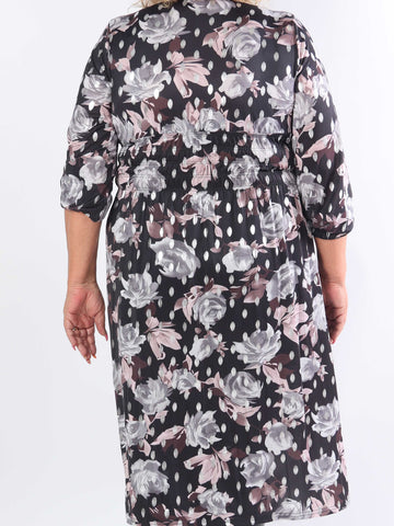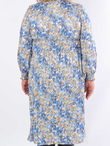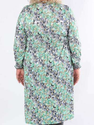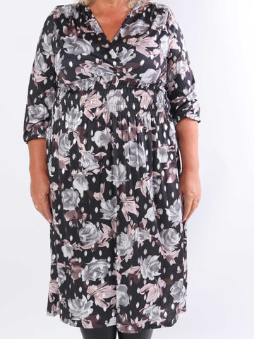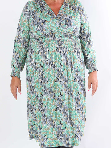 Pams Floral Short L/S - Elastisk plus size kjole med smock i livet