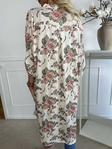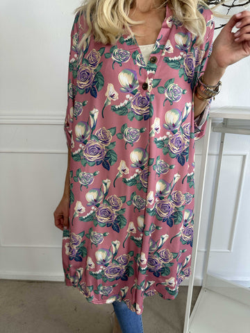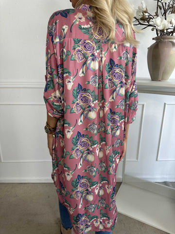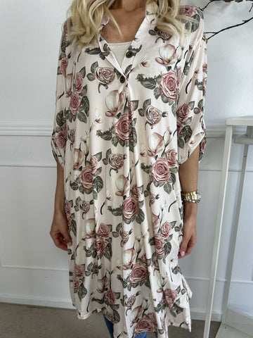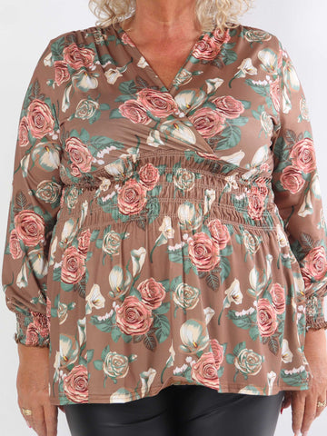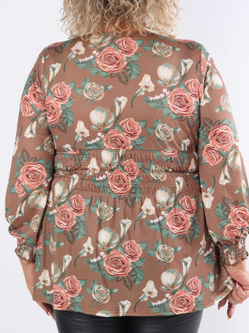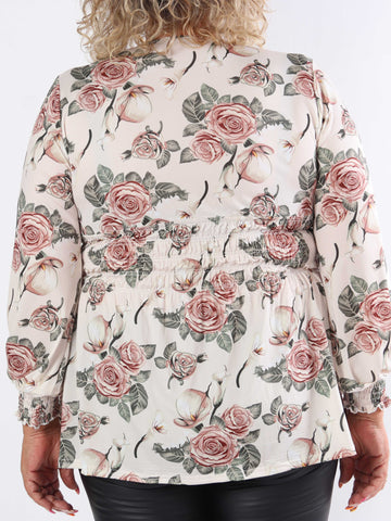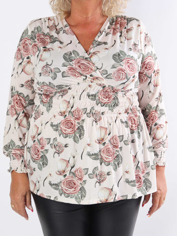 Pams Rose Shirt L/S - Elastisk plus size bluse i krølfrit stof med roser