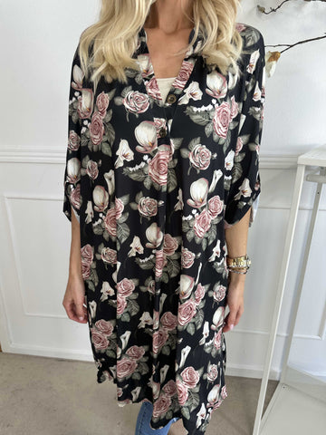 Pams Blossom Short L/S - Plus size kjole i krølfrit stof med sølv detaljer