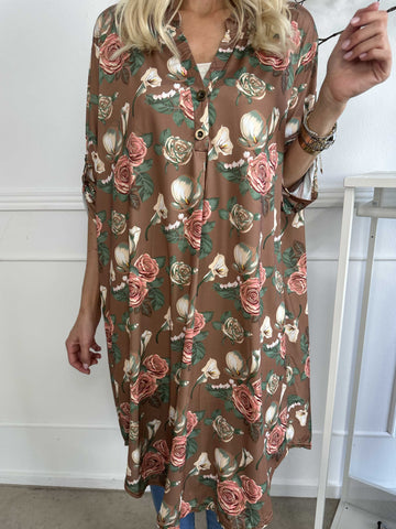 Pams Floral Midi L/S - Elastisk plus size kjole i krølfrit stof