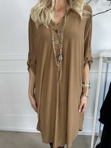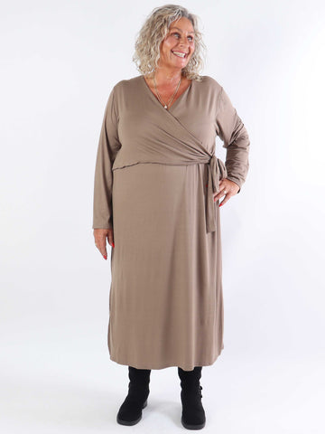 Pams Boho Midi L/S - Elastisk plus size kjole i krølfrit stof