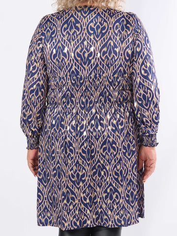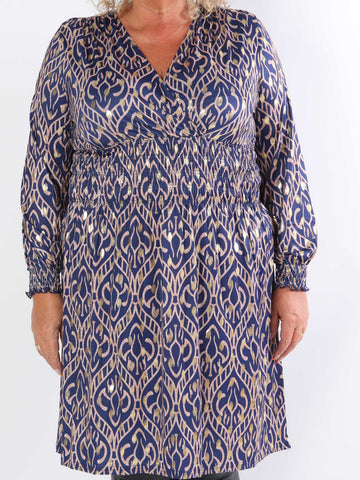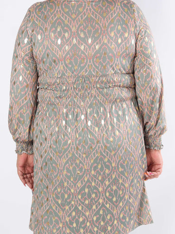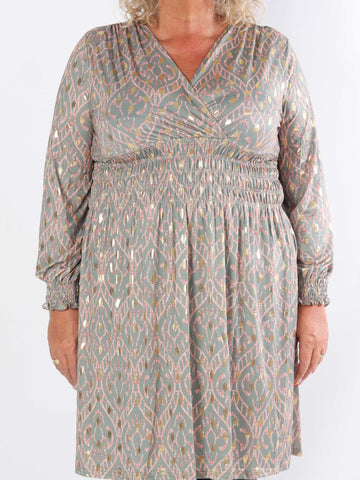 Pams Boho Short L/S - Elastisk plus size mønstret kjole i krølfrit stof