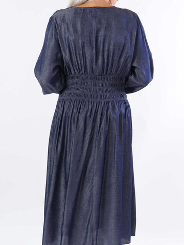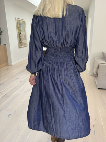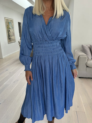 Pams Denim Midi L/S - Plus size kjole med smock i livet