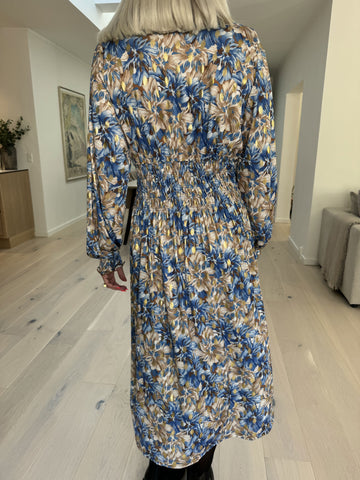Pams Floral Short L/S - Elastisk kjole med smock i livet