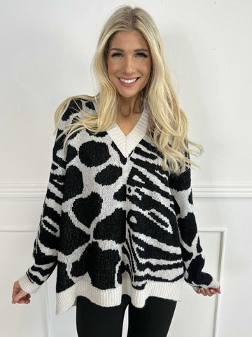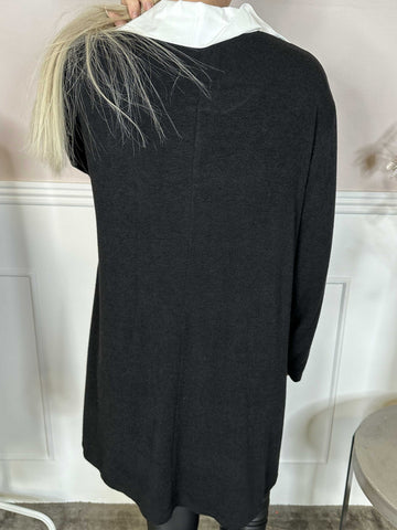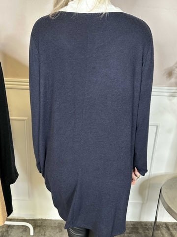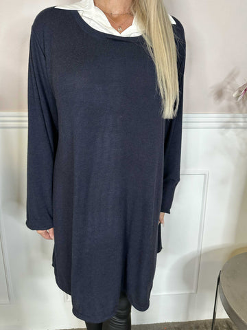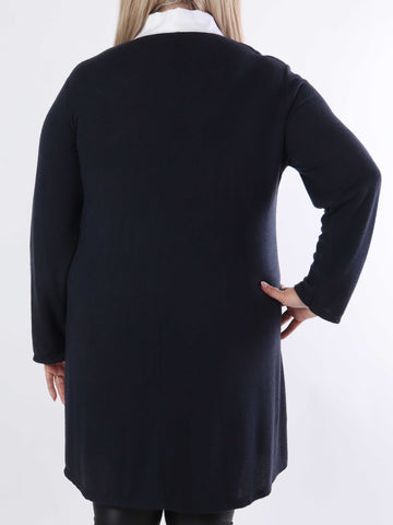 Clarita - Lang blød strikbluse med hvid skjortekrave