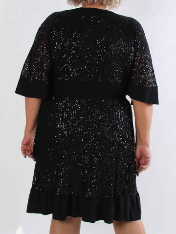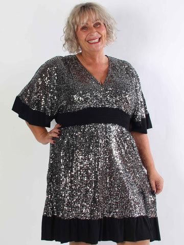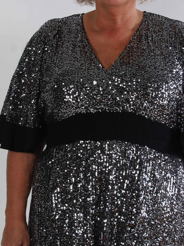 Pamela Glitter Short - Plus size pailletkjole med flæser og smock