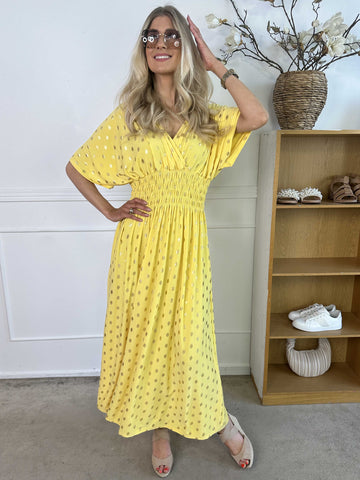 Pamela Gold Flower Short - Elastisk kjole med smock og flæser