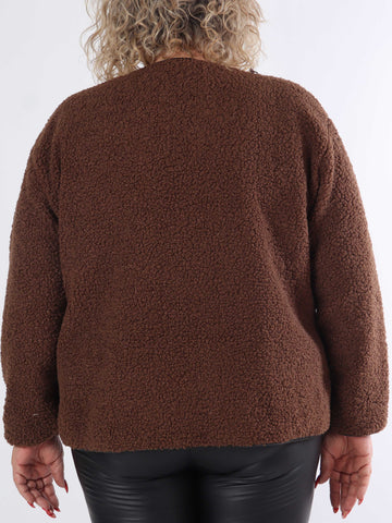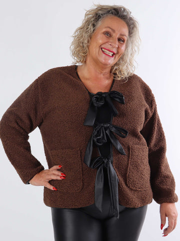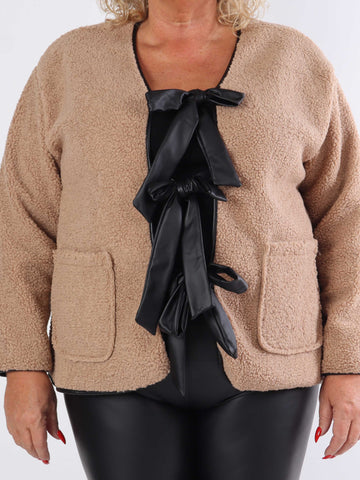 Danya - Plus size fleece cardigan med læderlook sløjfer