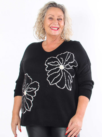 Delores - Plus size strik med blomstermotiv og perler