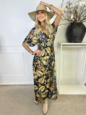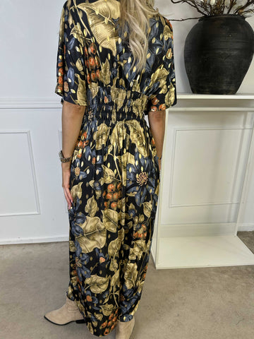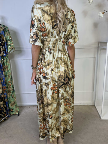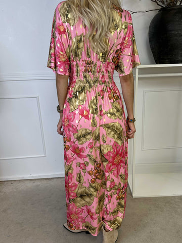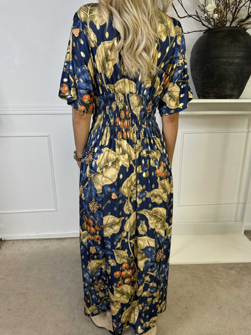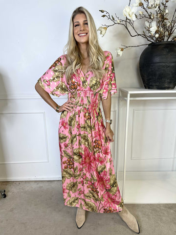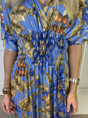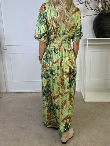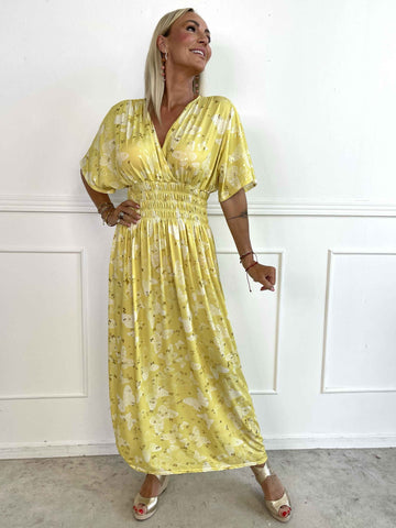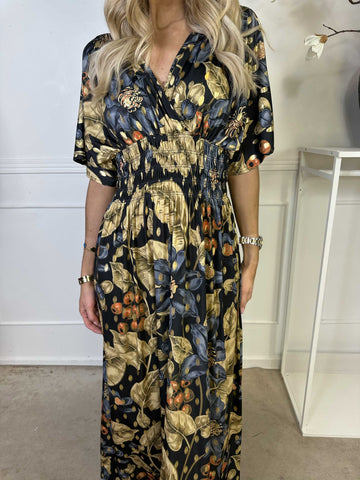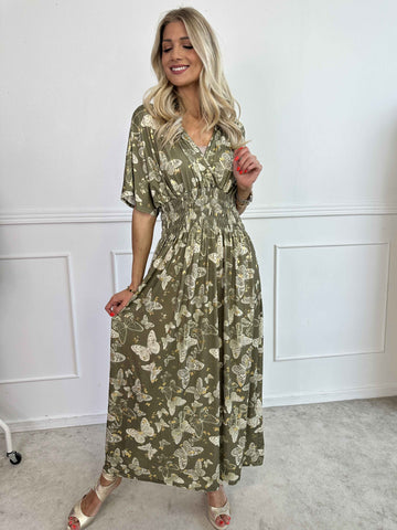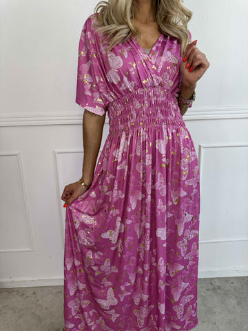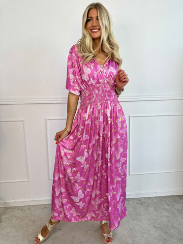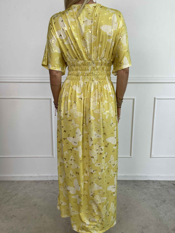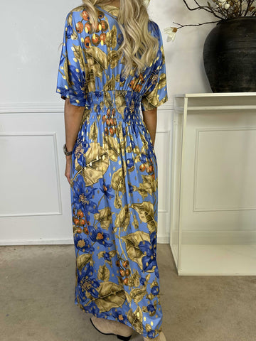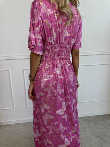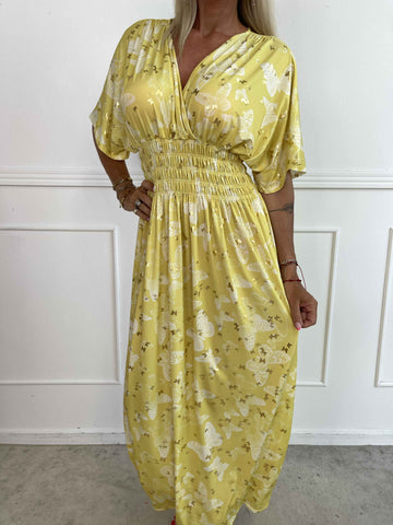 Pams Butterfly - Lang elastisk kjole med smock i livet