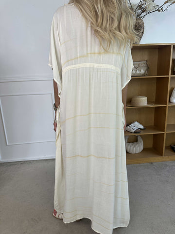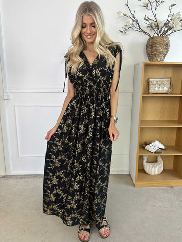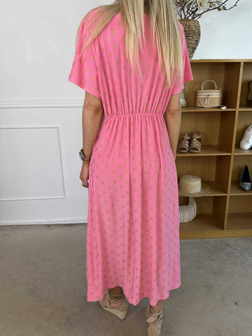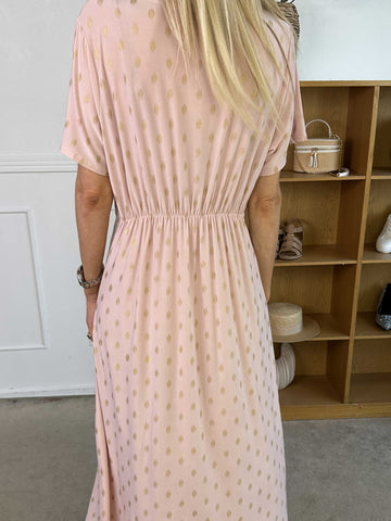 Molly Dot - Lang kjole i elastisk stof med knudedetalje og guld dutter