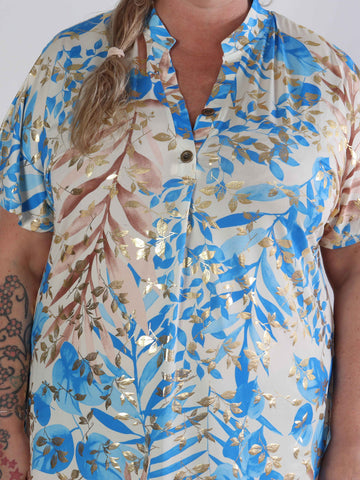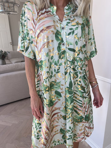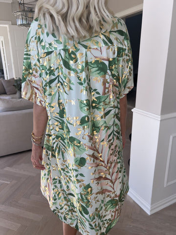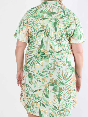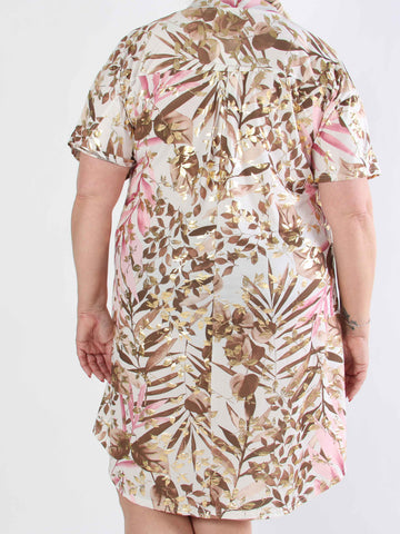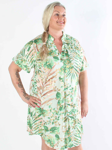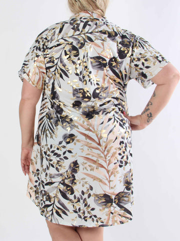Ebba Gold Leaf Sleeveless - Plus size skjortekjole i elastisk stof med bladprint