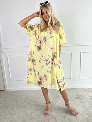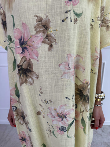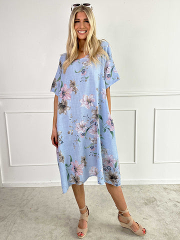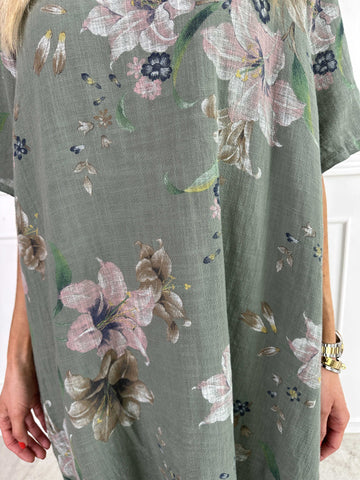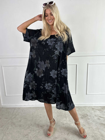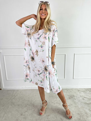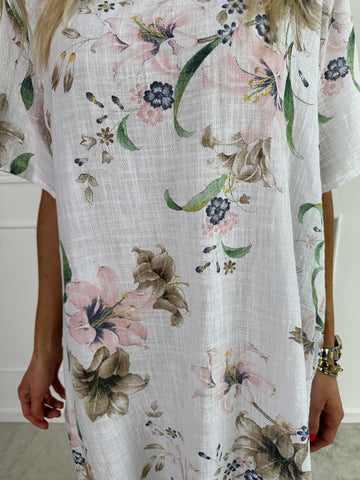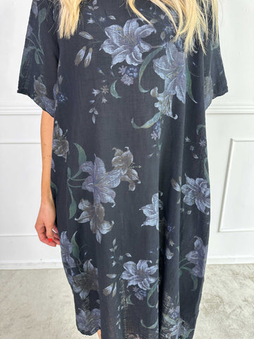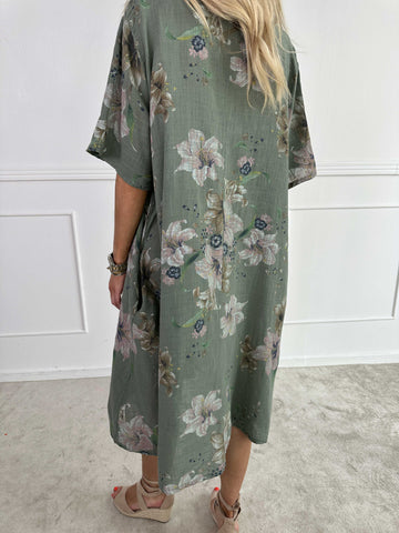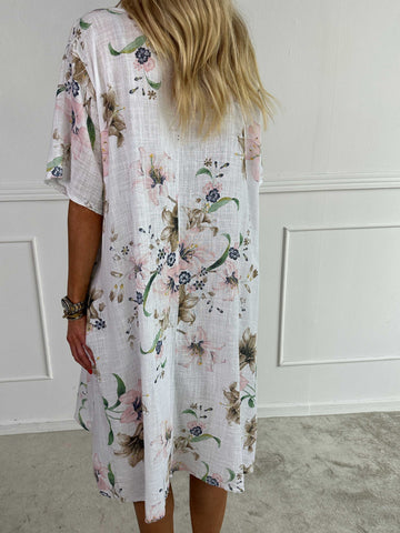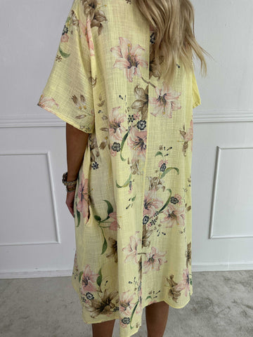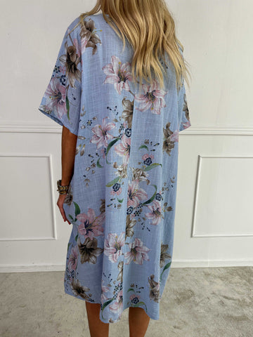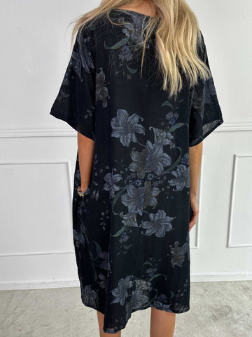 Gry - Bomuldskjole i hørlignende stof med blomsterprint