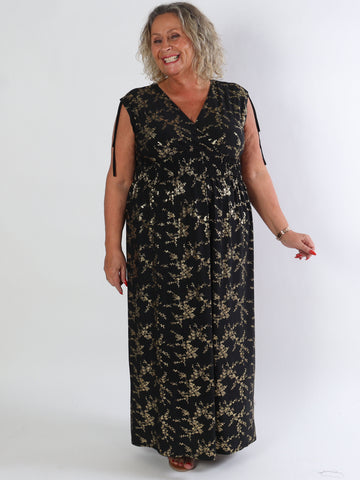 Pams Gold Sleeveless - Lang elastisk plus size kjole med guld print