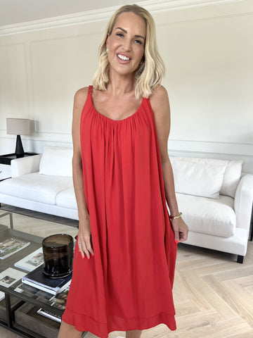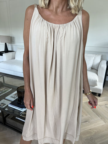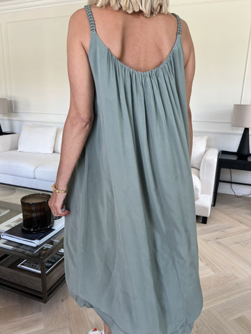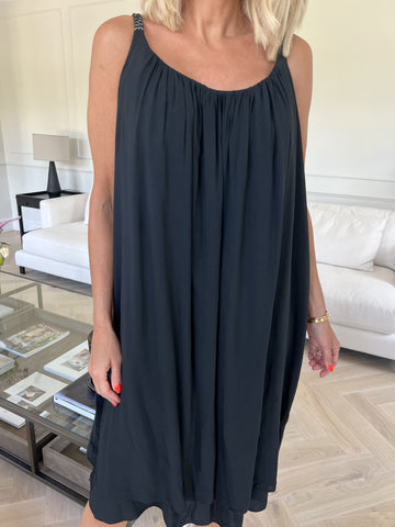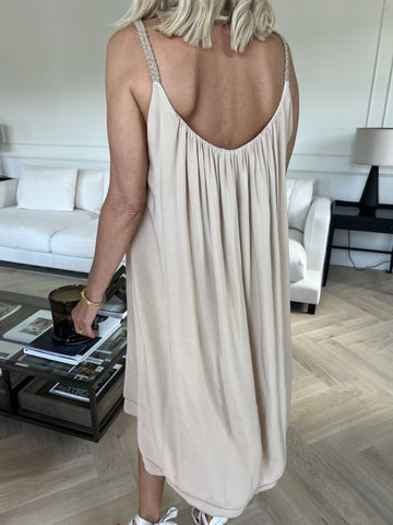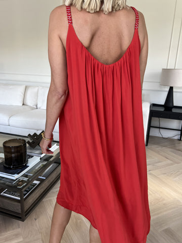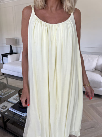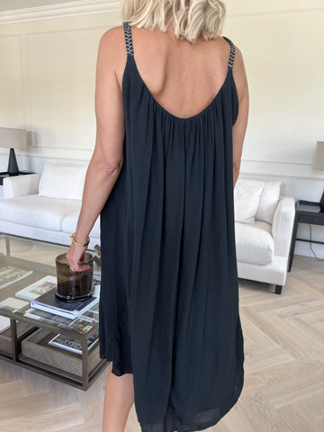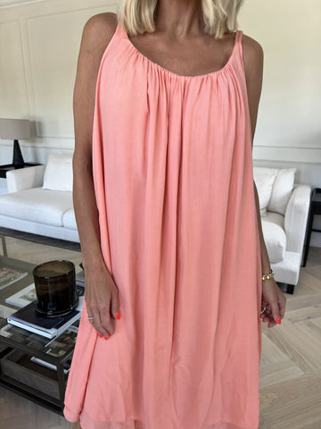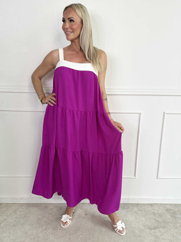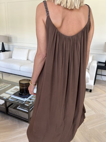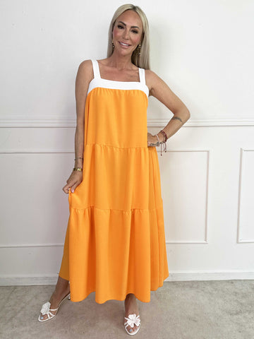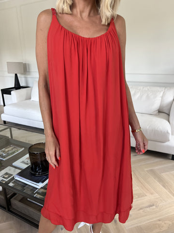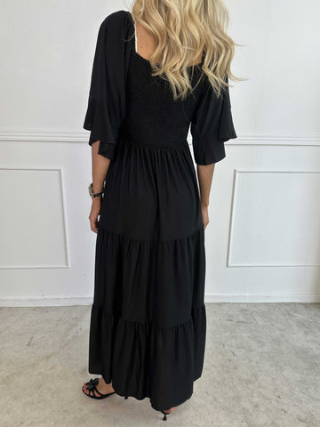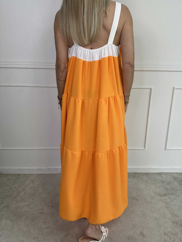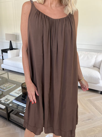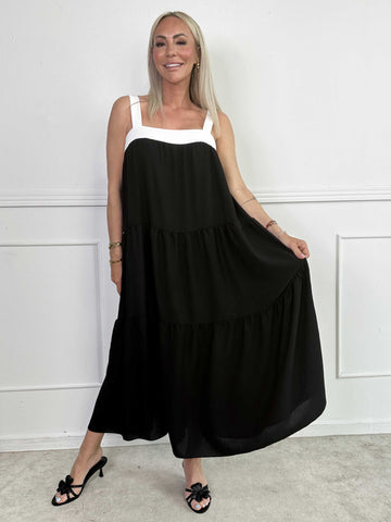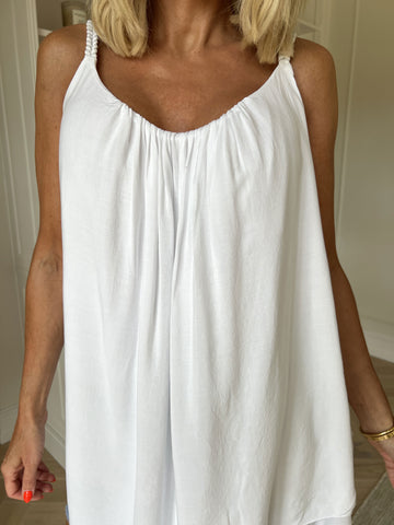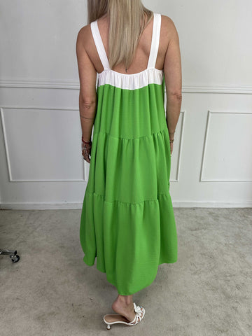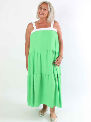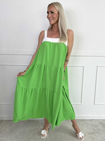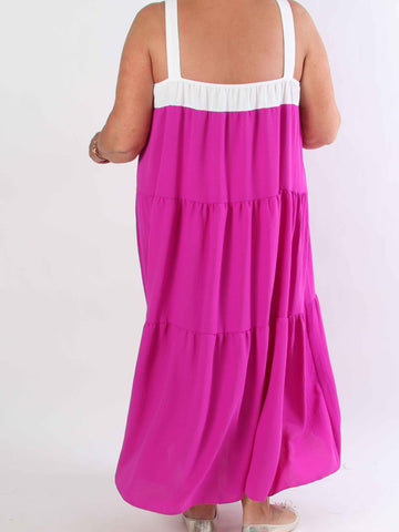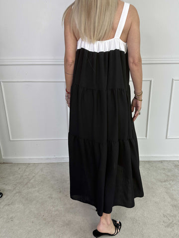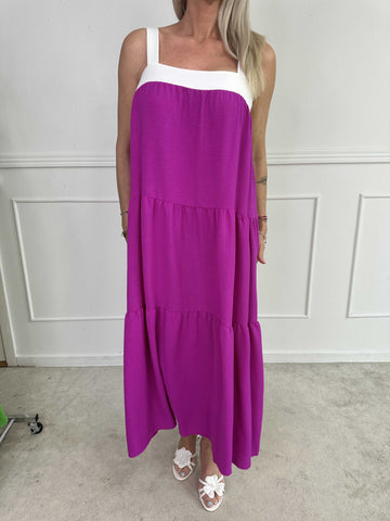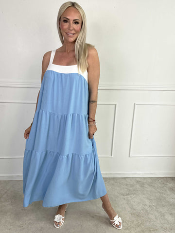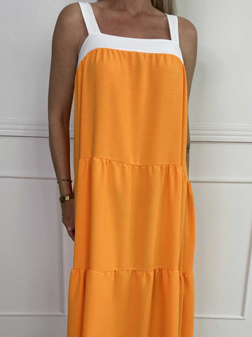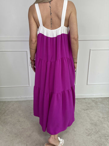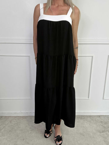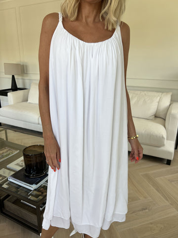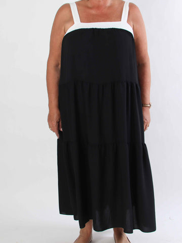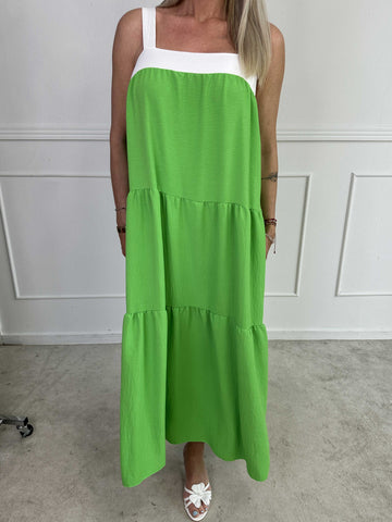 Glenna - Lang lag på lag kjole i viskose med hvide stropper