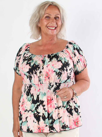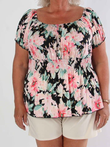 Cora Flower Shirt - Elastisk plus size bluse med smock under brystet
