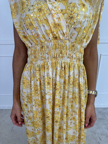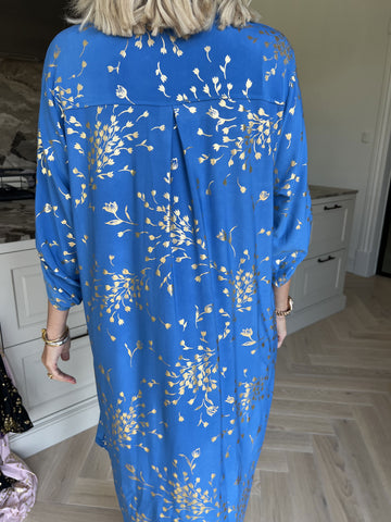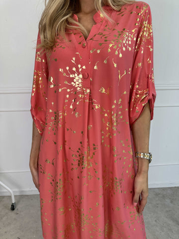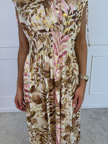 Ebba Gold Leaf Long - Elastisk ensfarvet kjole med guld blomsterprint
