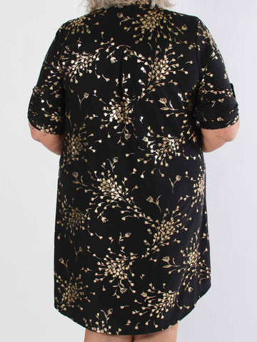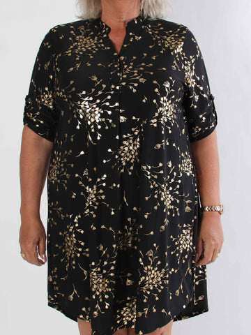 Ebba Gold Leaf Long - Elastisk ensfarvet plus size kjole med guld blomsterprint