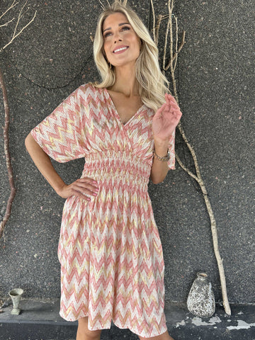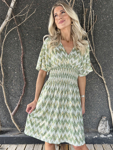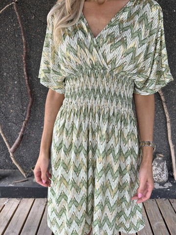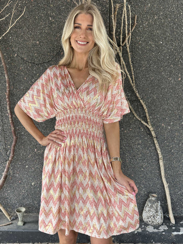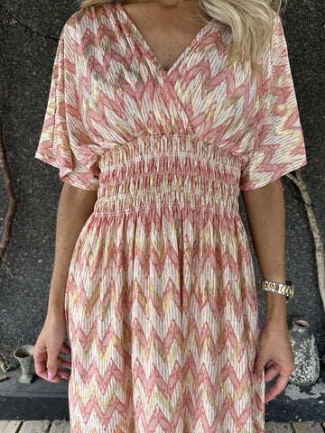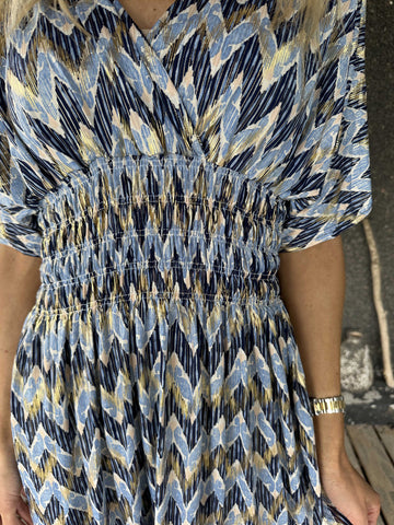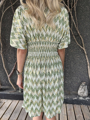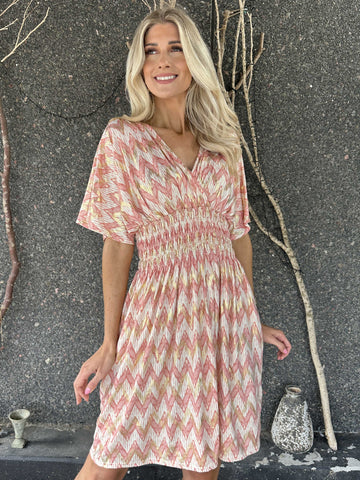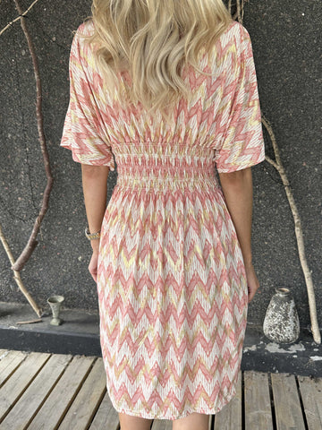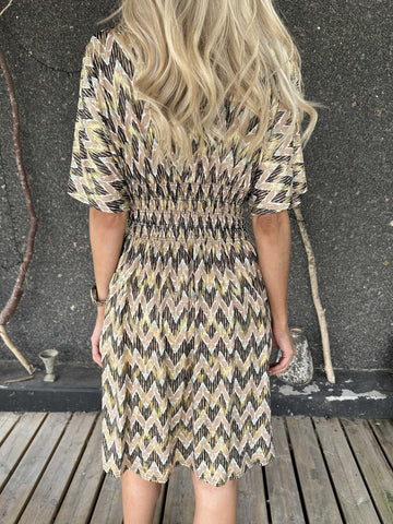 Pams Zigzag Short - Elastisk mønstret kjole med guld detaljer