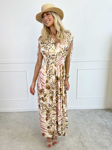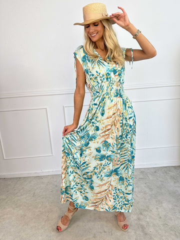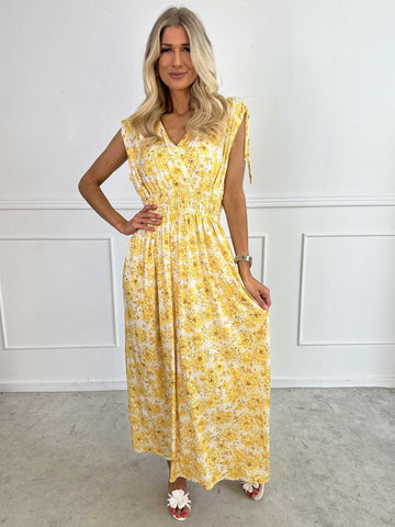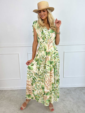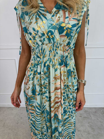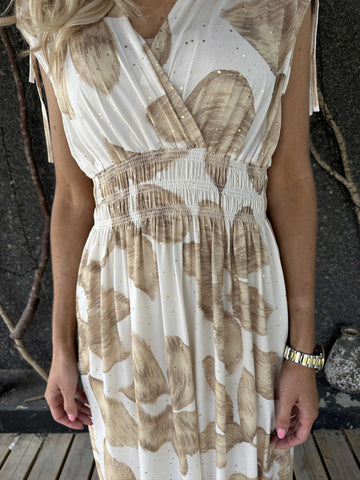 Pams Leaf Gold Sleeveless - Lang elastisk kjole med sødt blad print