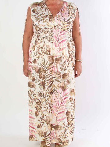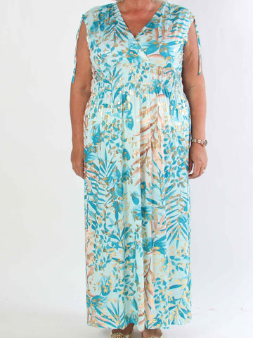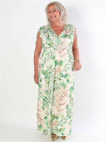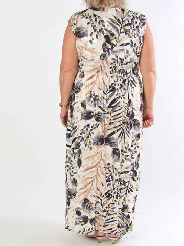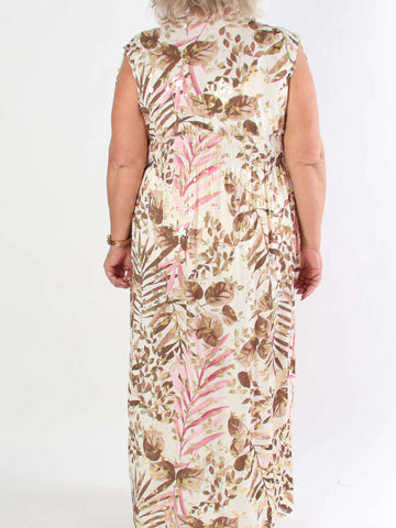 Pams Leaf Gold Sleeveless - Lang elastisk plus size kjole med sødt blad print