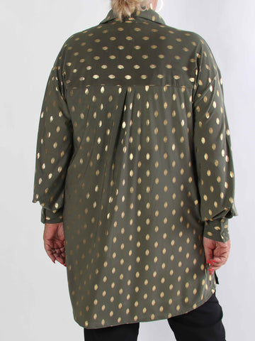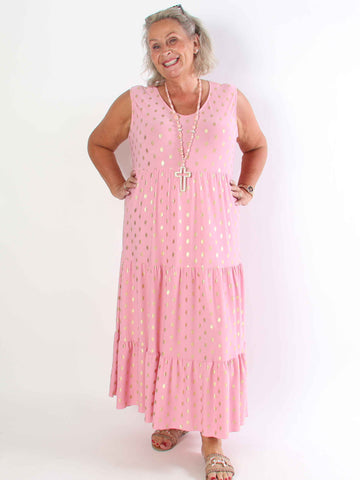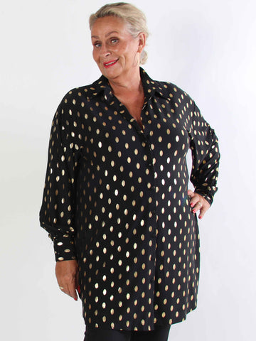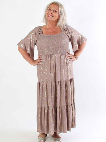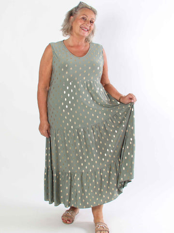 Karini Gold - Lang elastisk plus size kjole med guld dutter