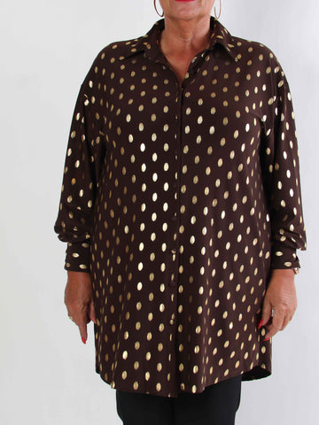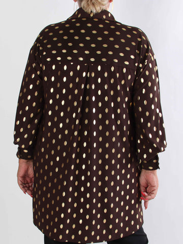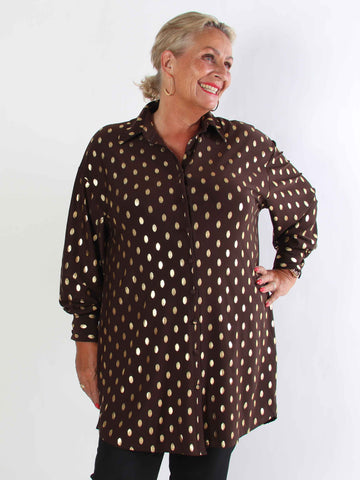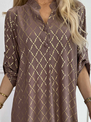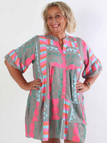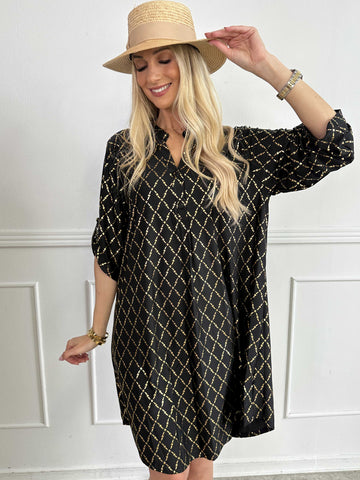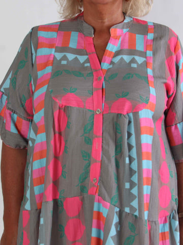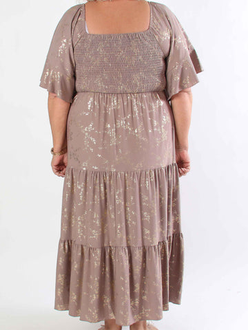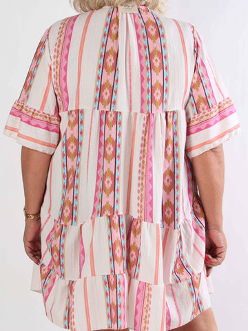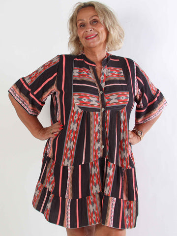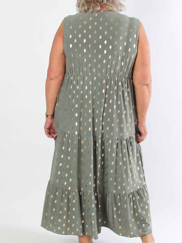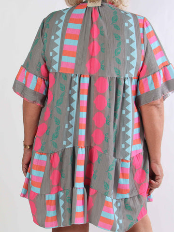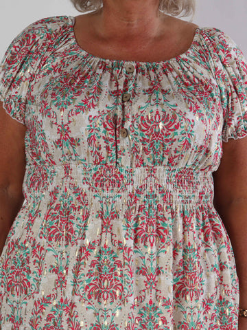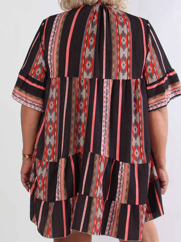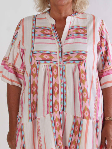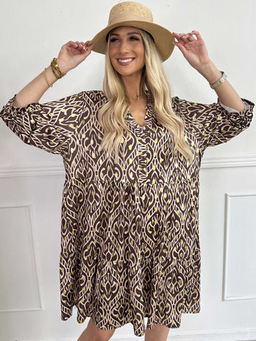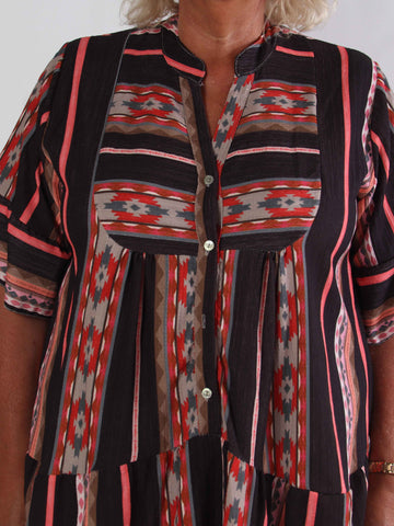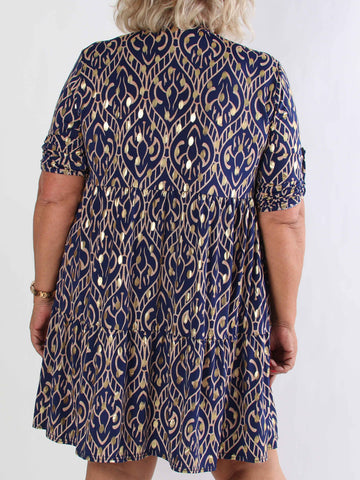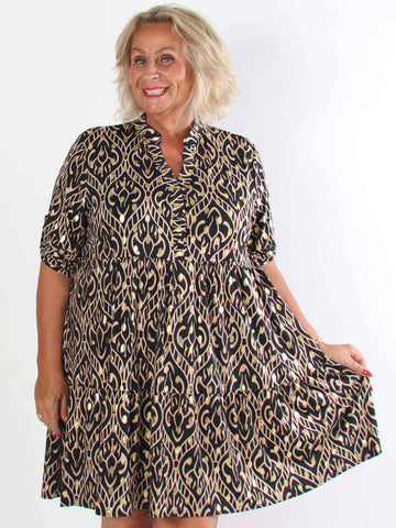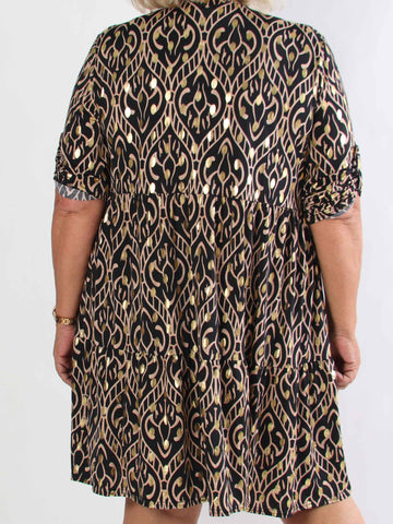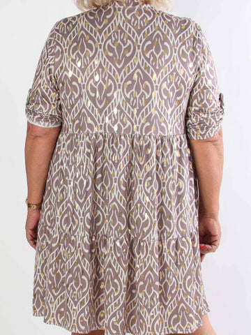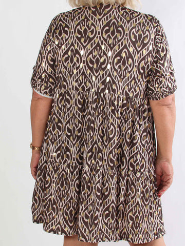 Milano Boho Midi - Mønstret plus size kjole med guld dutter og lag på lag look