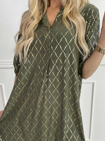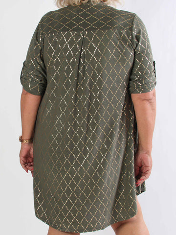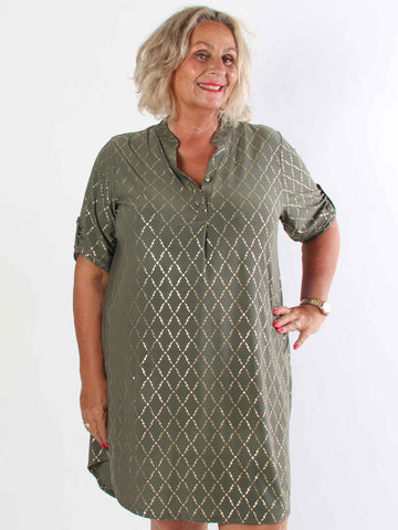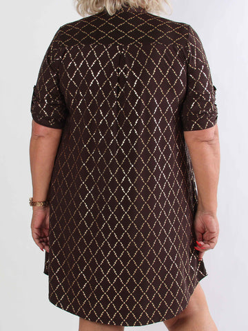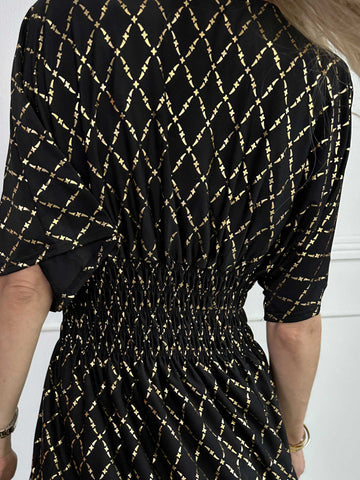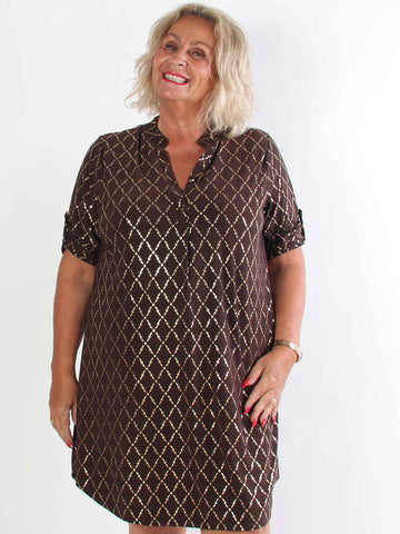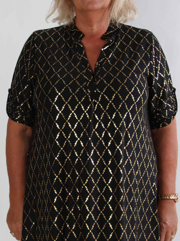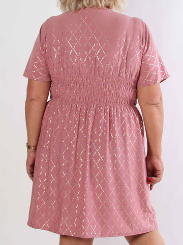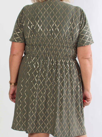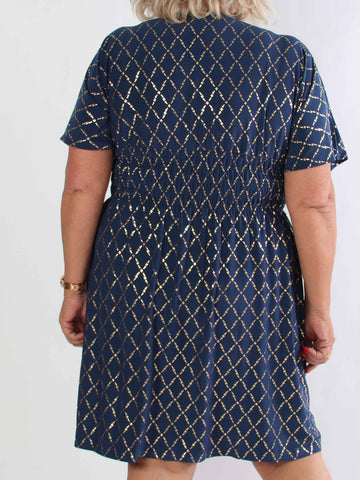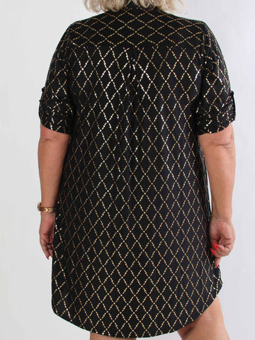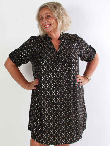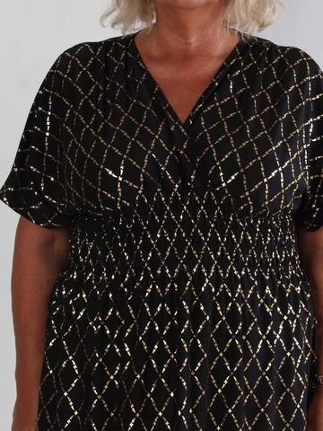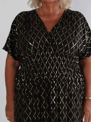 Pams Gold Check Short - Kort elastisk plus size kjole med guld detaljer