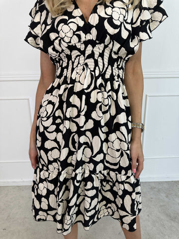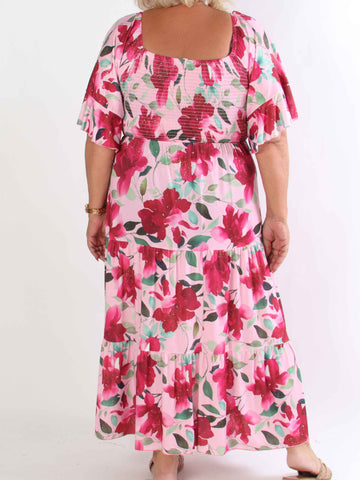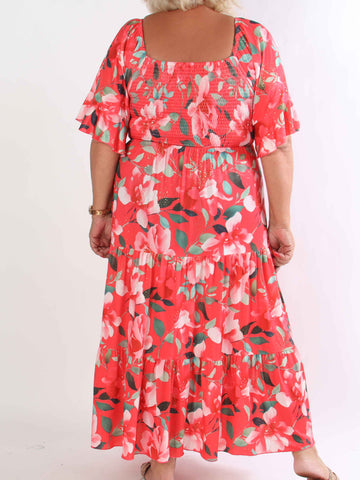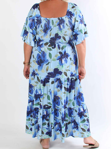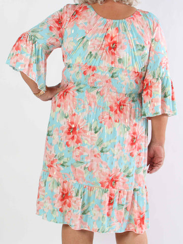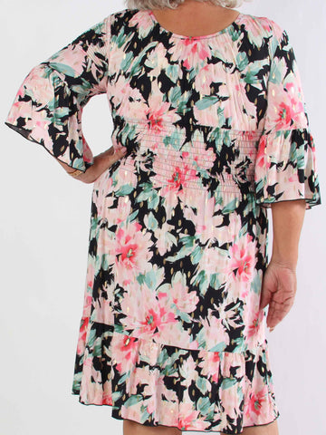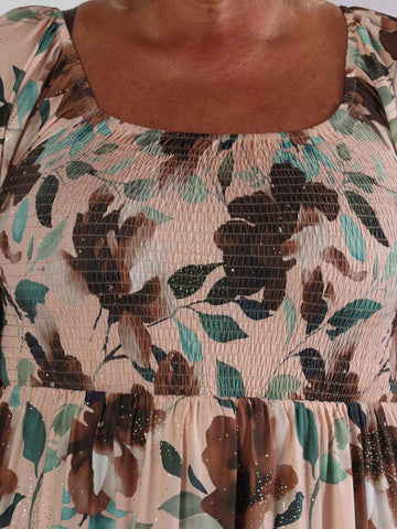Flora Flower - Blomstret plus size kjole med smock og flæse på ærmet