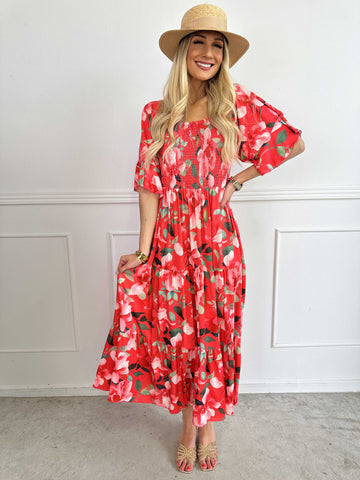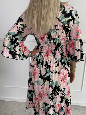 Flora Flower - Elastisk blomstret kjole med smock og flæse på ærmet