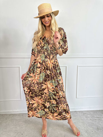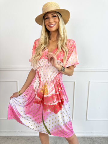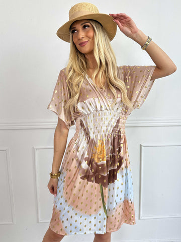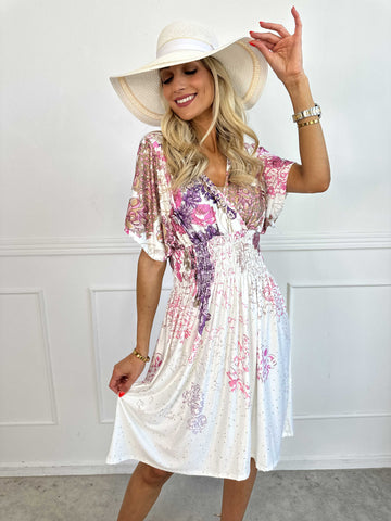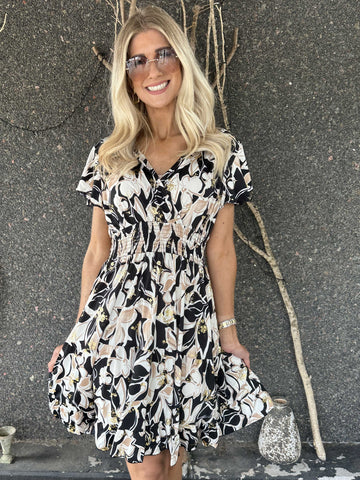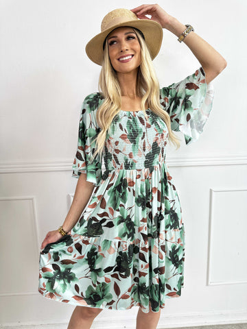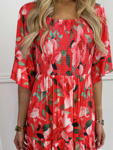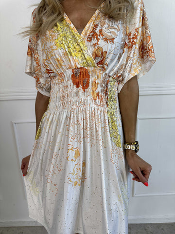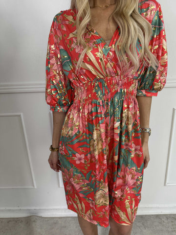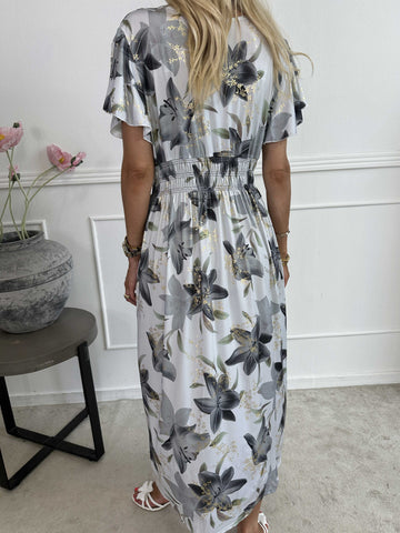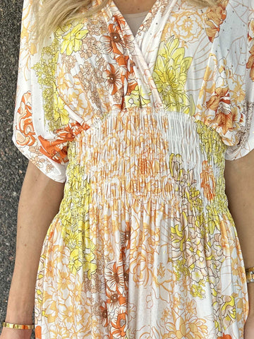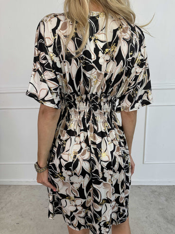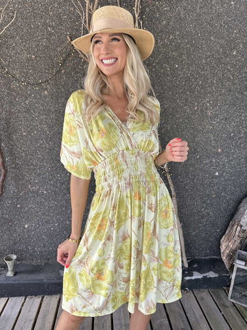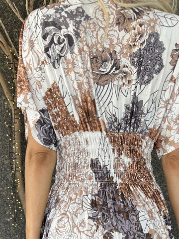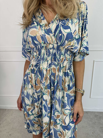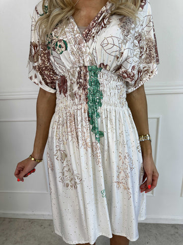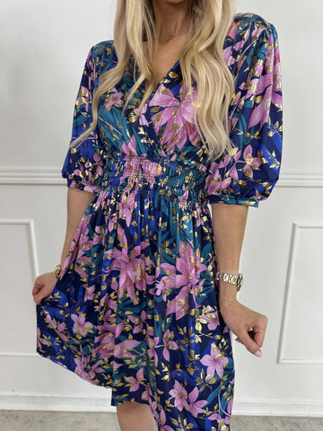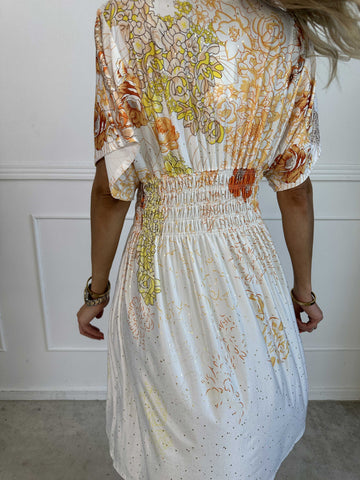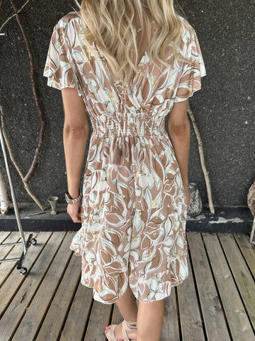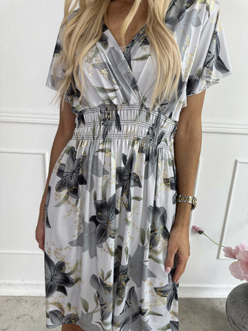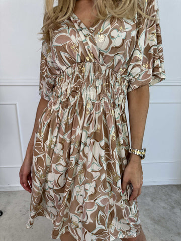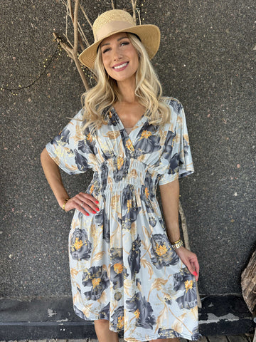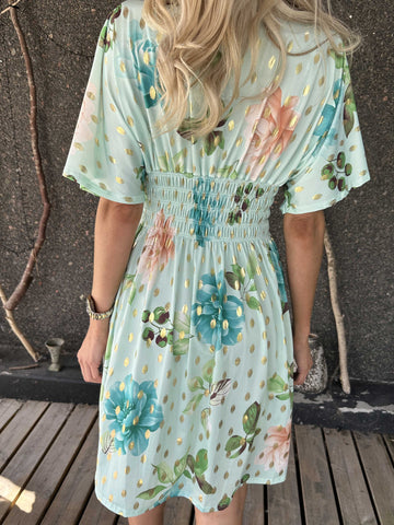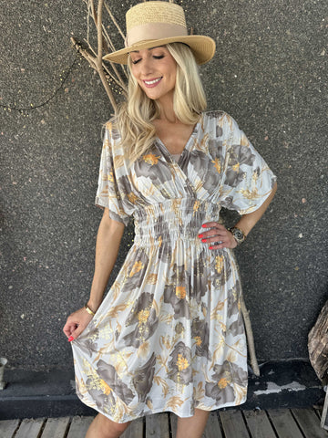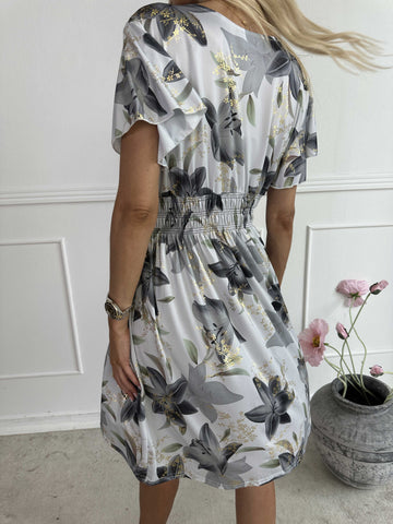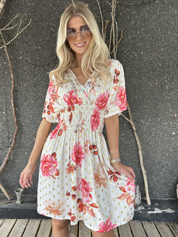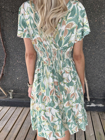 Elna Fiore Short - Blomstret elastisk kjole med smock over brystet