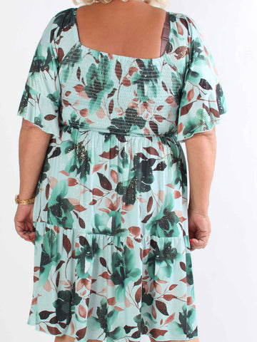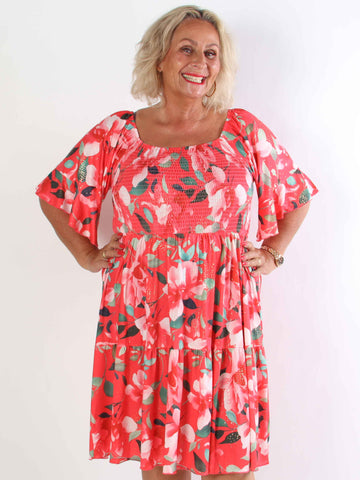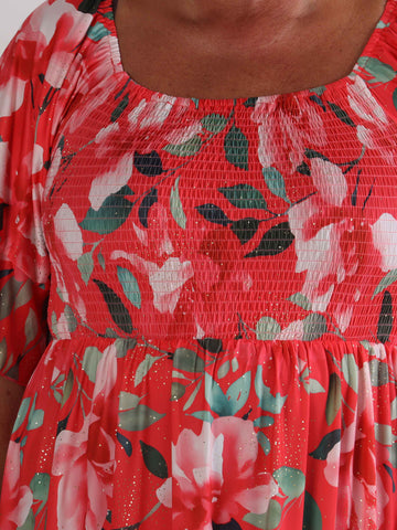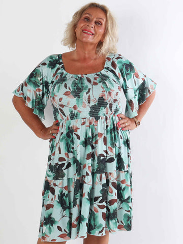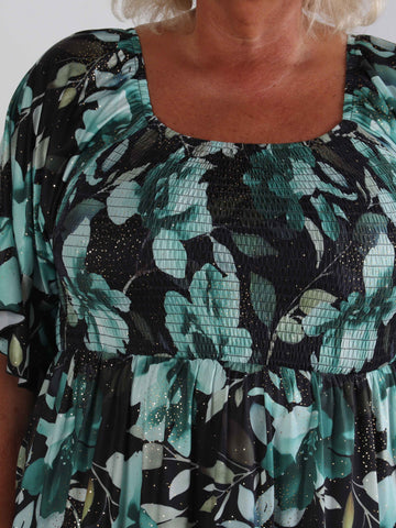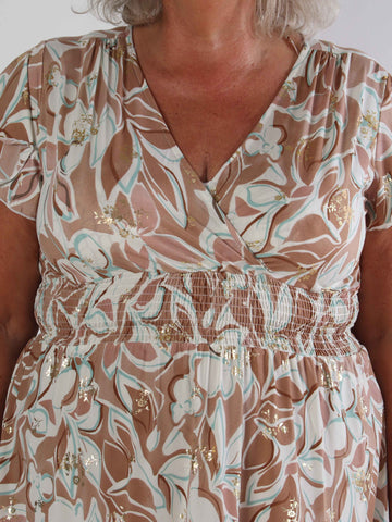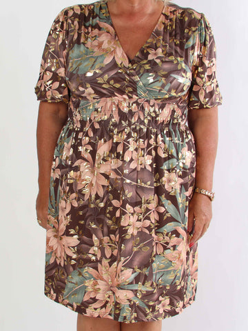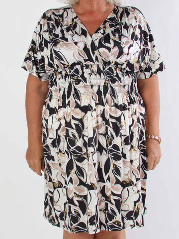 Elna Fiore Short - Blomstret elastisk plus size kjole med smock over brystet