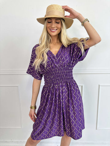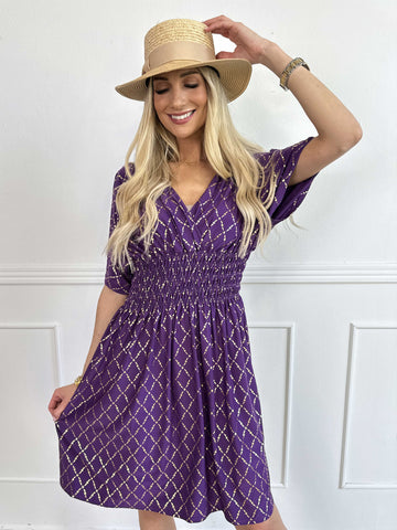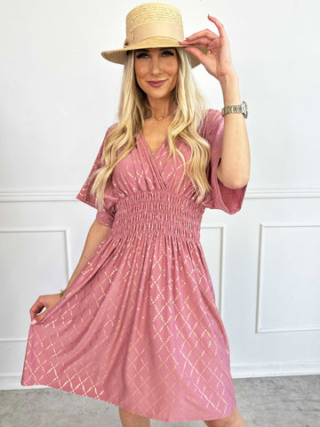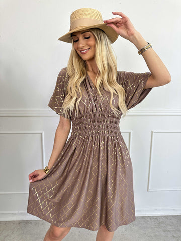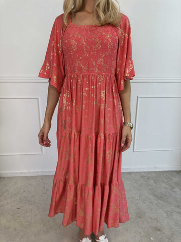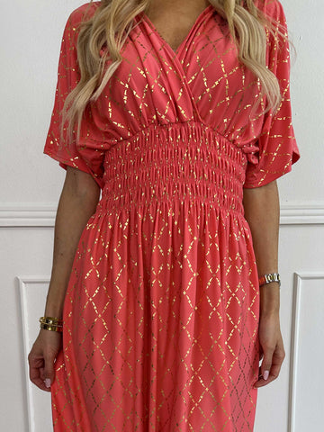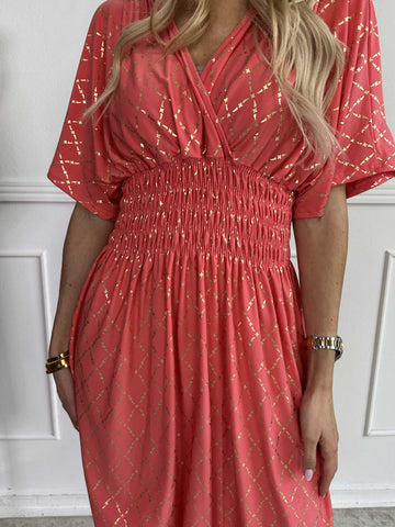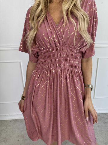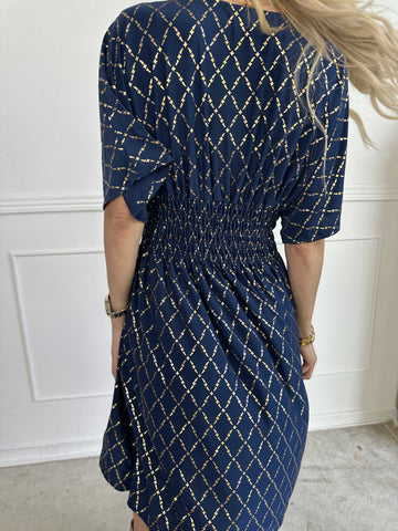 Elna Gold - Ensfarvet elastisk kjole med smock og guld print