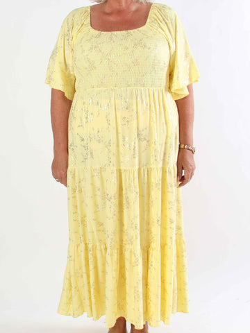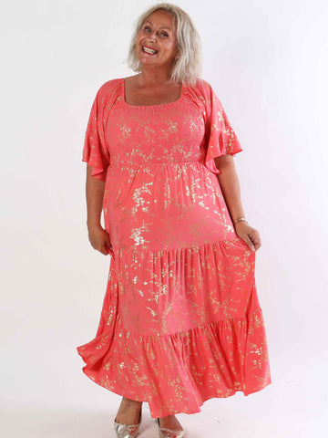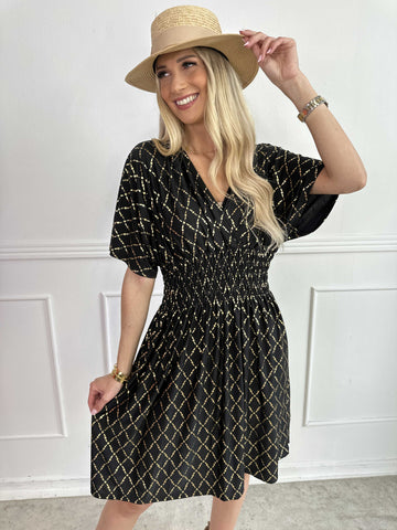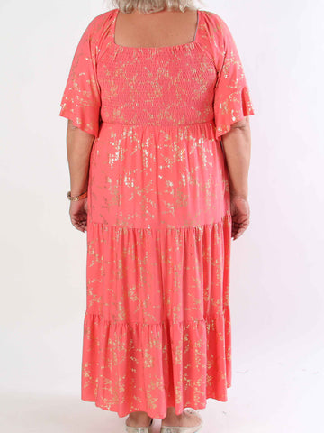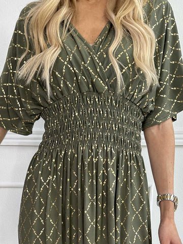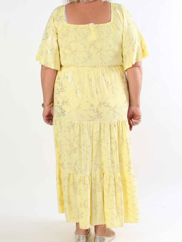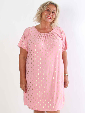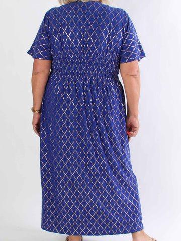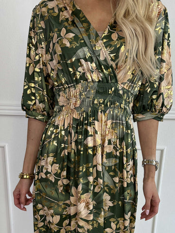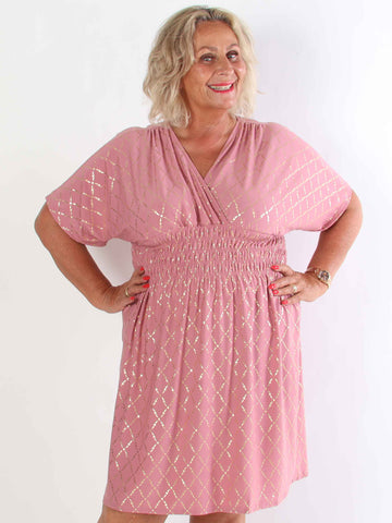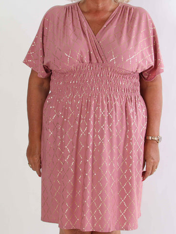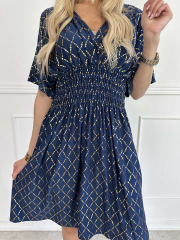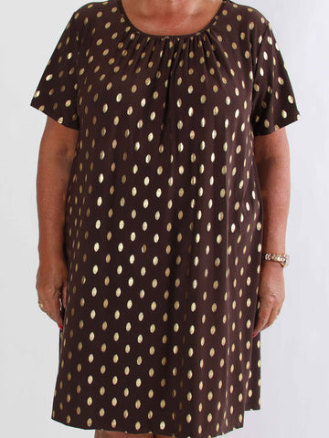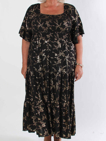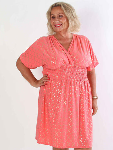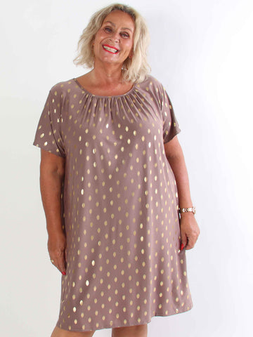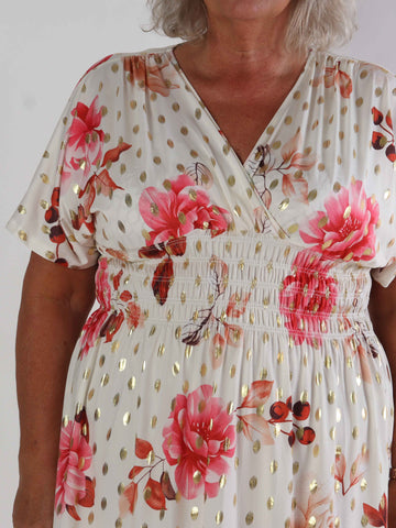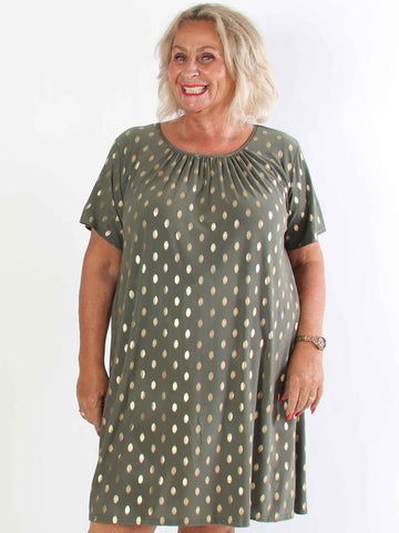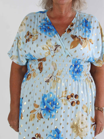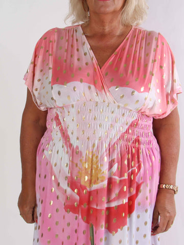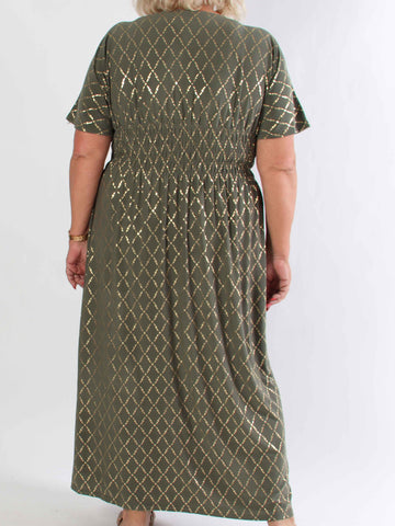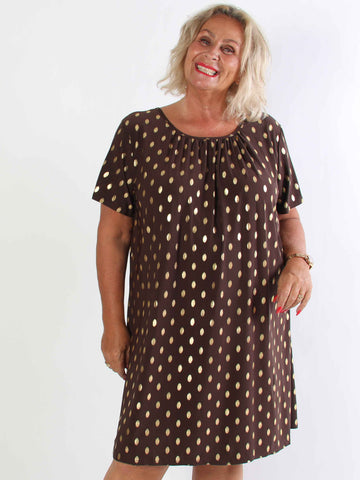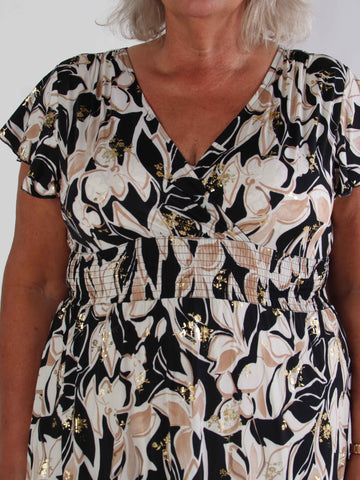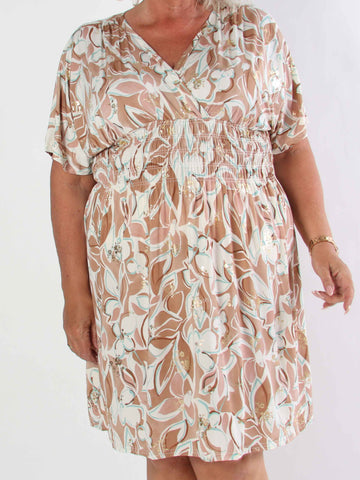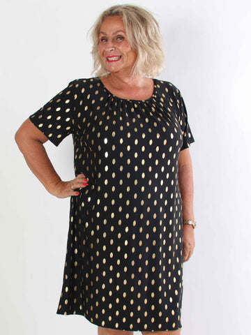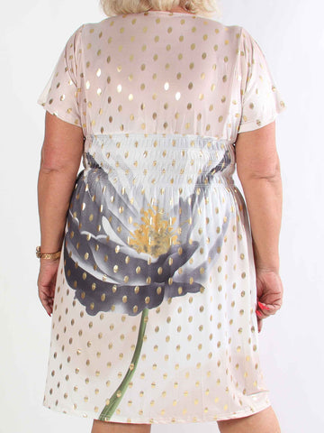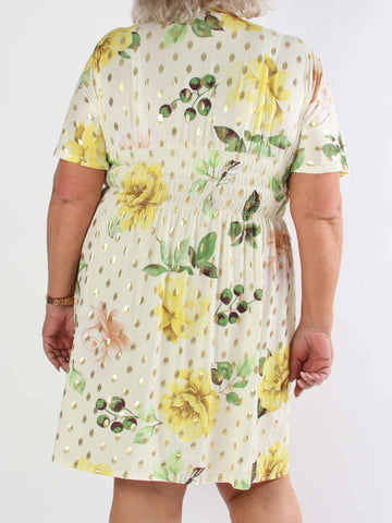 Maira Gold - Sød elastisk plus size kjole med guld print og smock