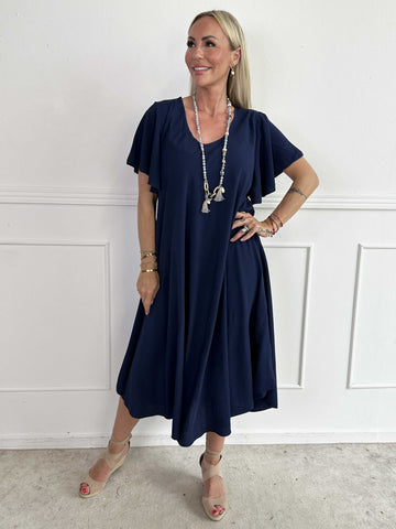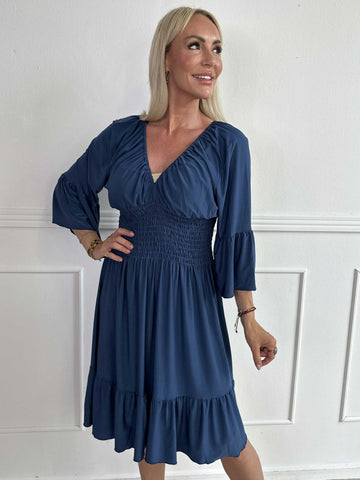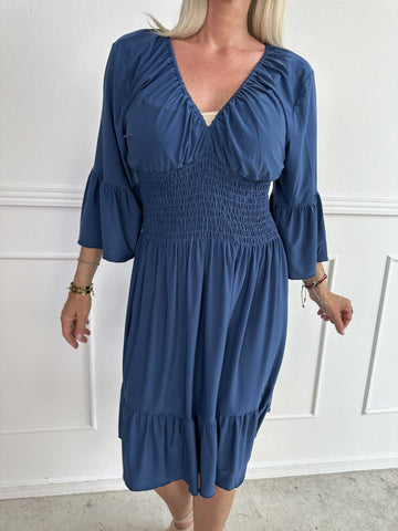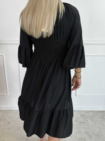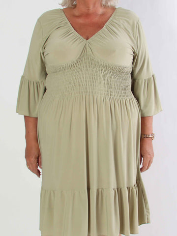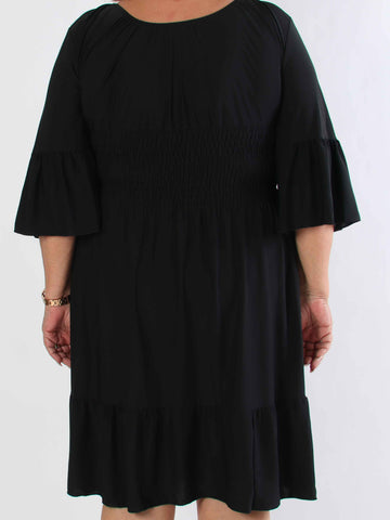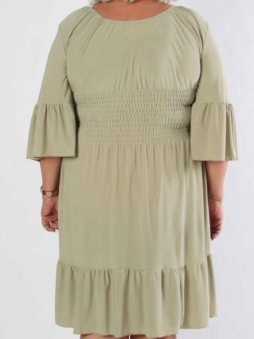 Flora Plain - Elastisk plus size kjole med smock og flæse på ærmet