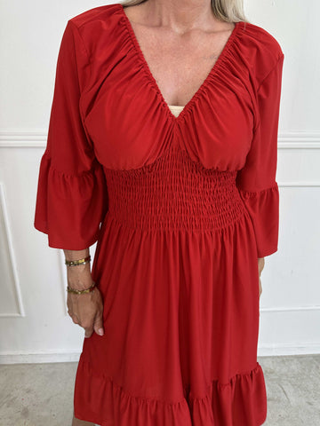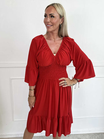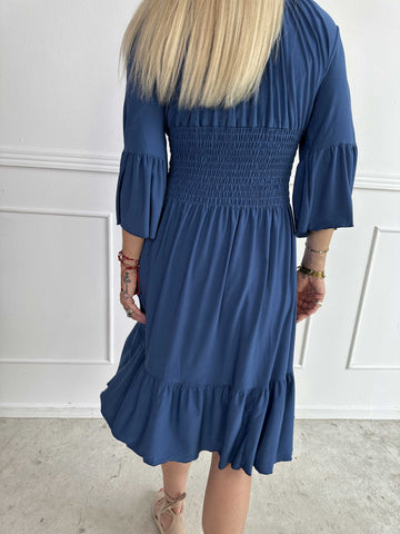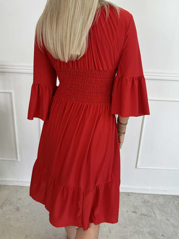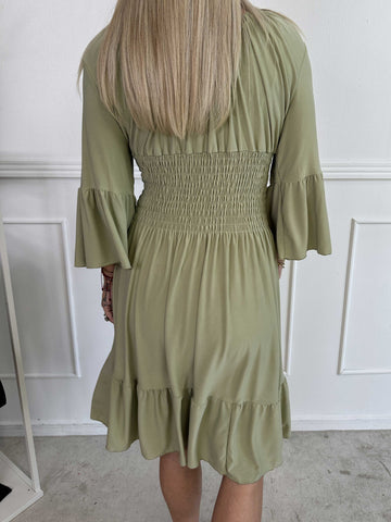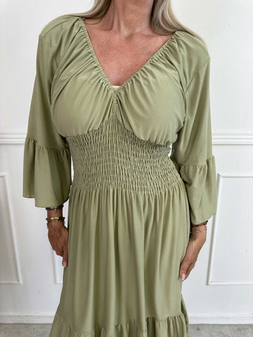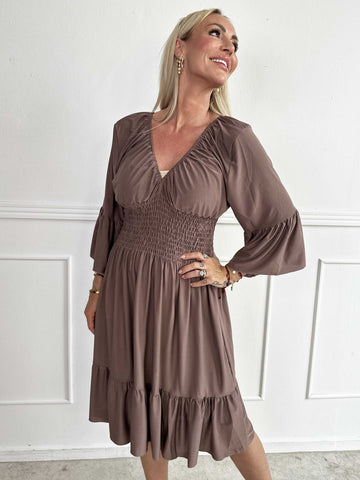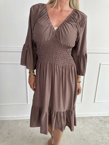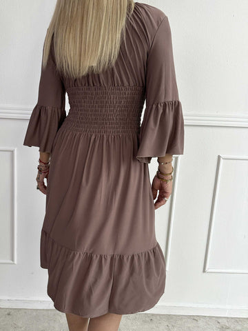 Flora Plain - Elastisk ensfarvet kjole med smock og flæse på ærmet