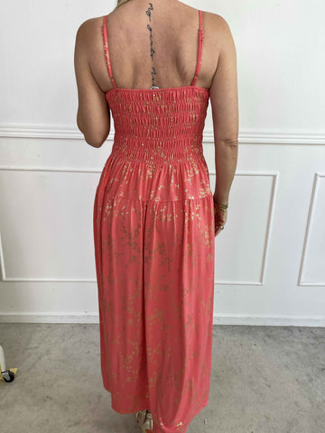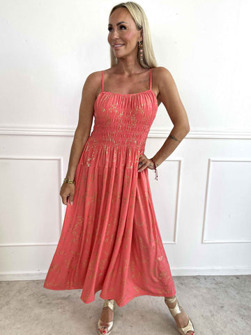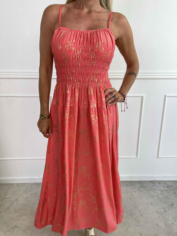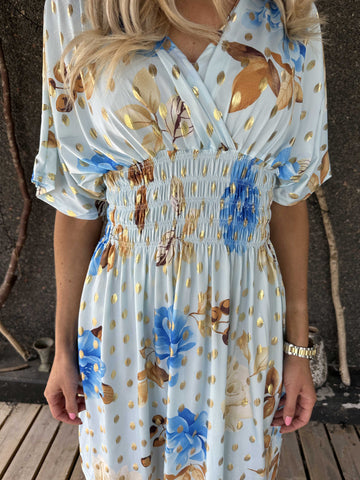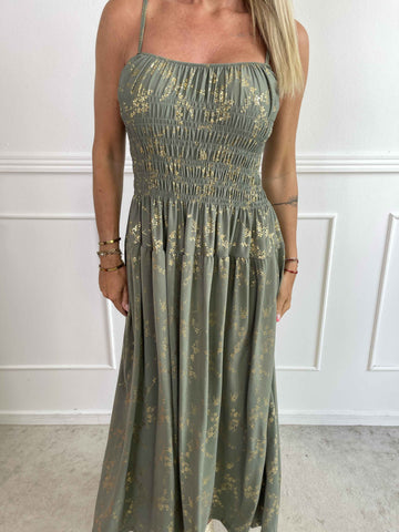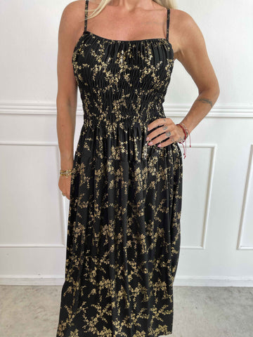 Maira Gold - Sød elastisk stropkjole med guld print og smock