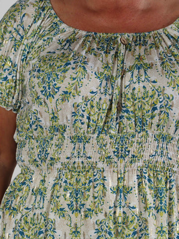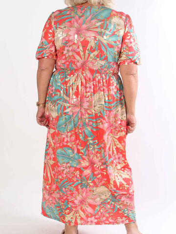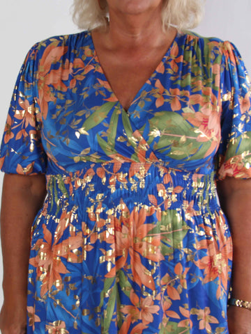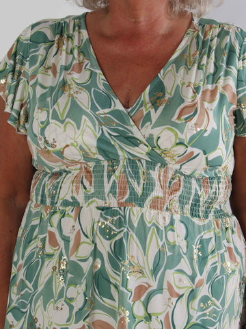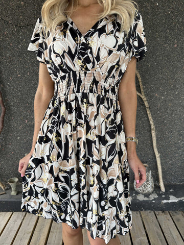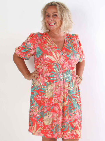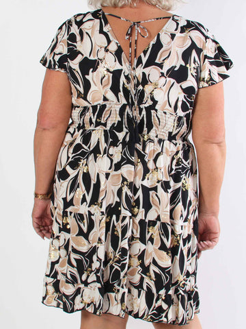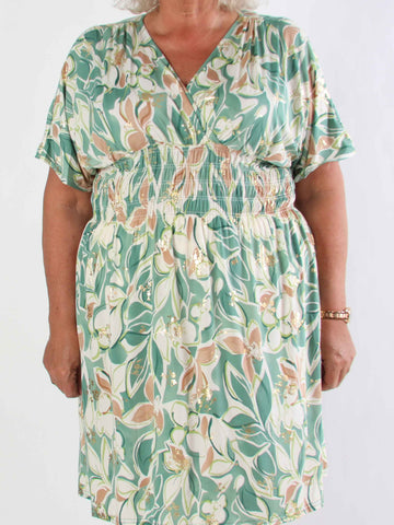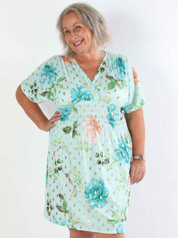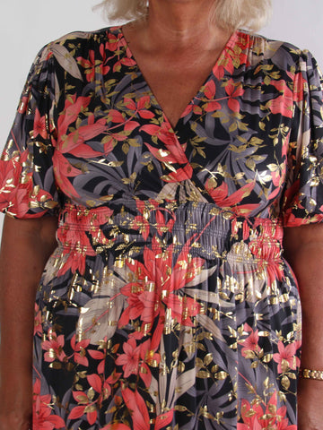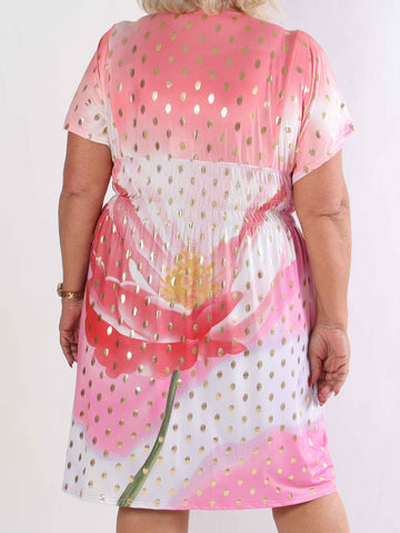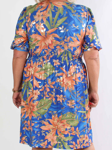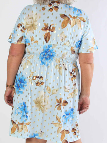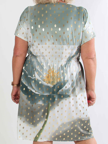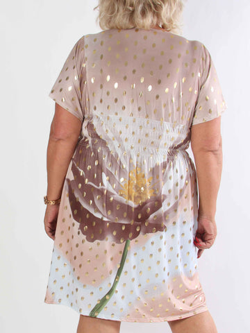 Pams Field Short - Kort elastisk plus size kjole med blomstermotiv og guld dutter
