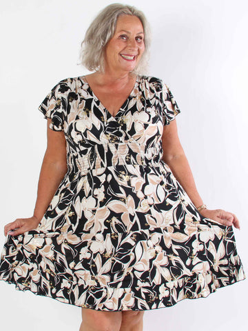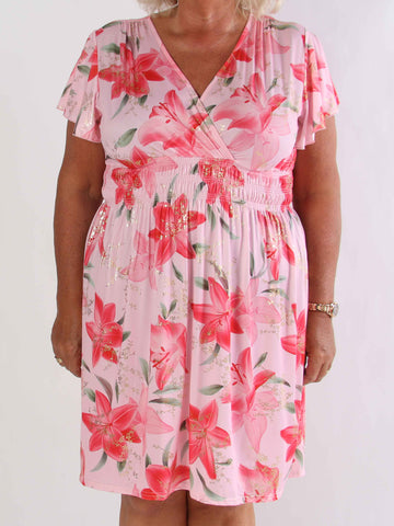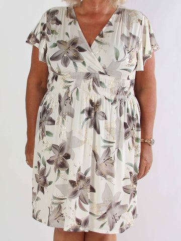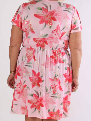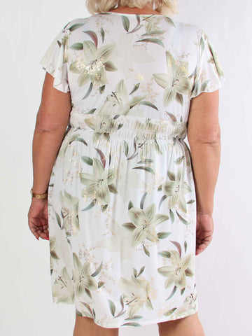 Pams Lilies Short - Kort elastisk plus size kjole med lilje motiver og guld detaljer