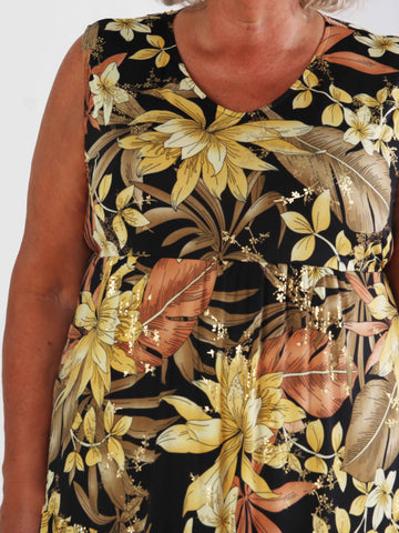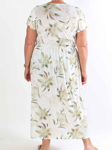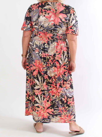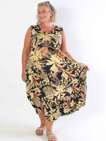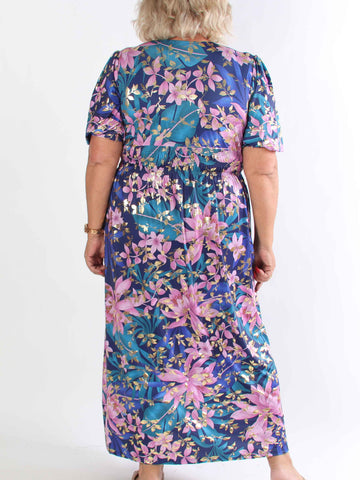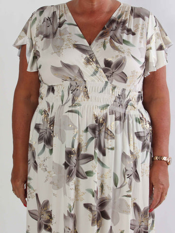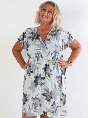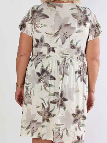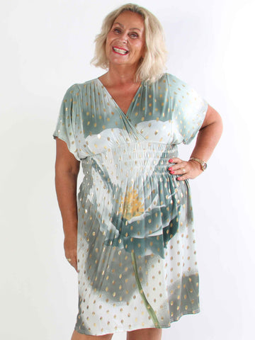 Pams Lilies - Elastisk plus size kjole med lilje motiver og guld detaljer