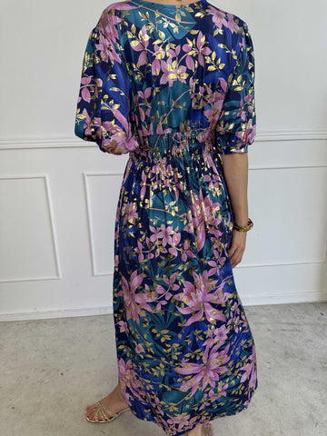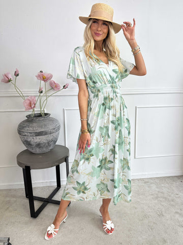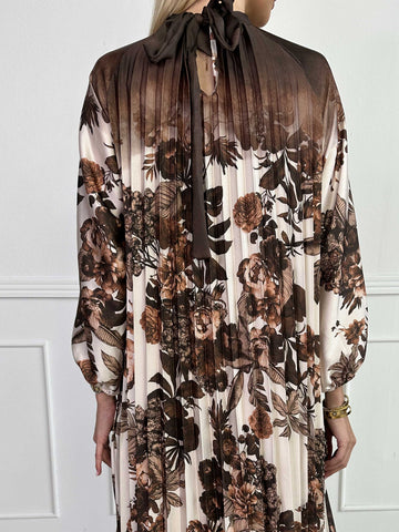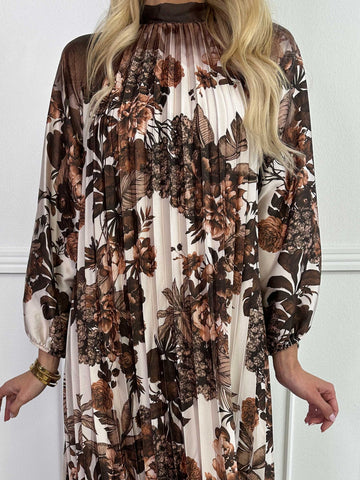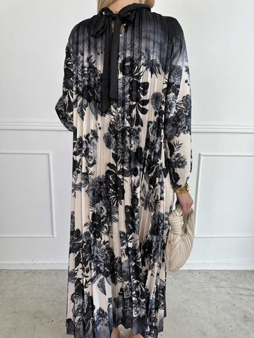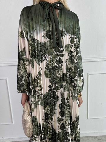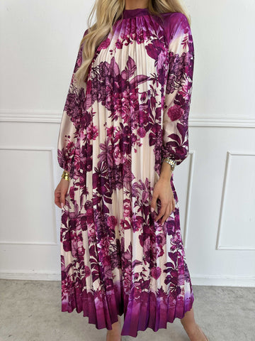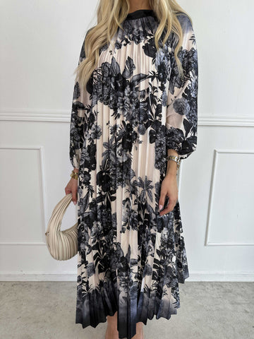 Eloise - Lang kjole i satin med blomsterprint og plisseringer