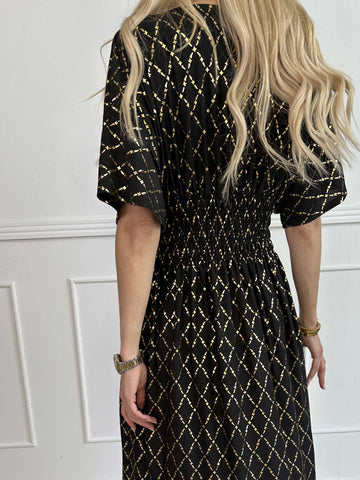 Ebba Gold Check Long - Elastisk kjole med guld detaljer