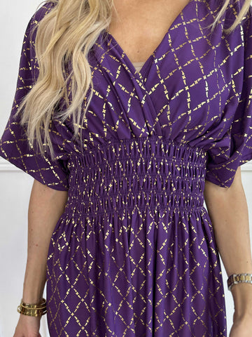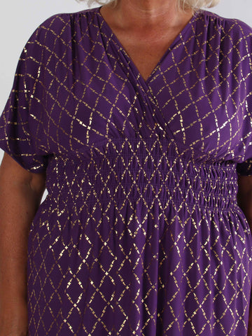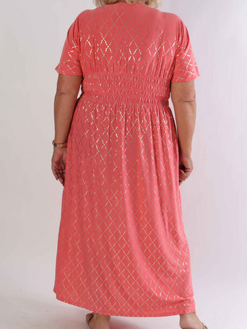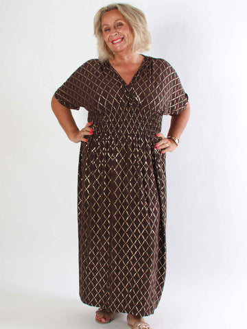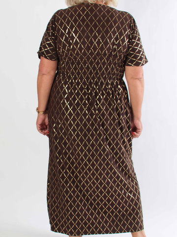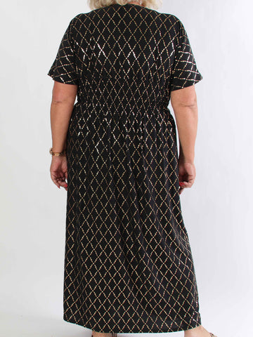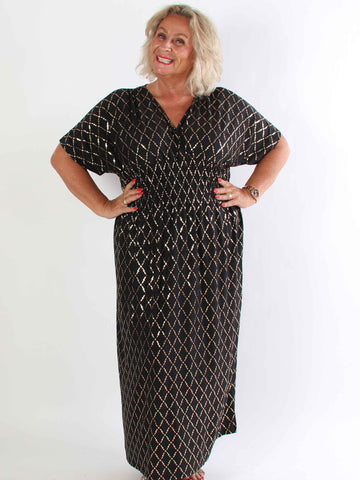 Pams Gold Check - Lang elastisk plus size kjole med guld detaljer
